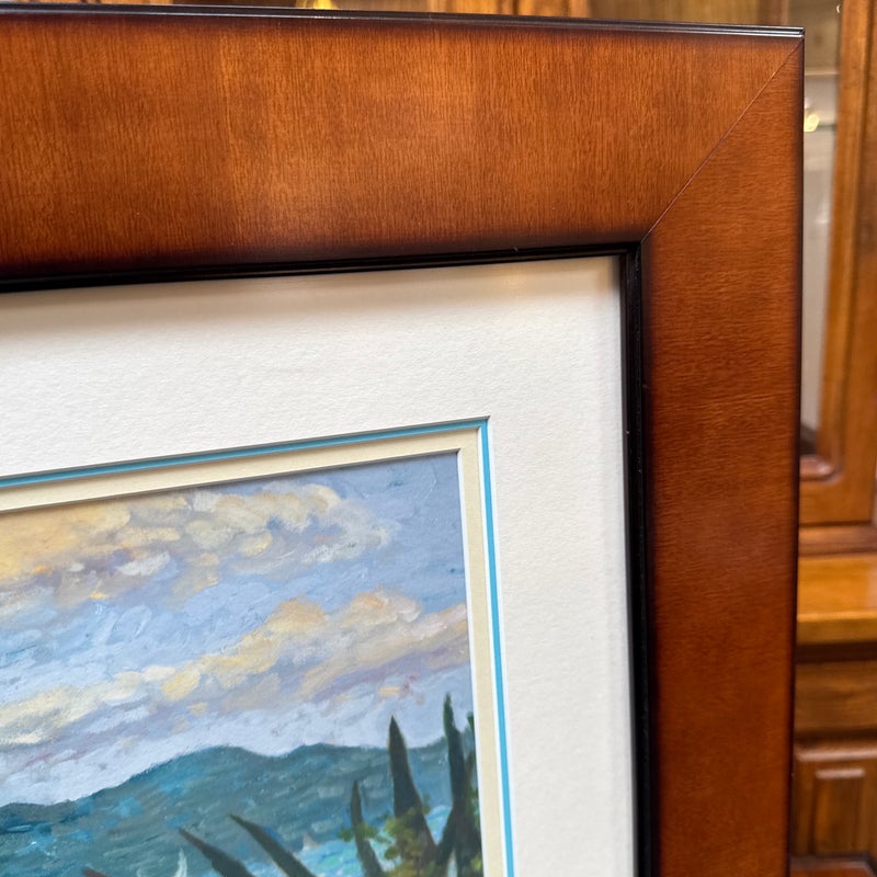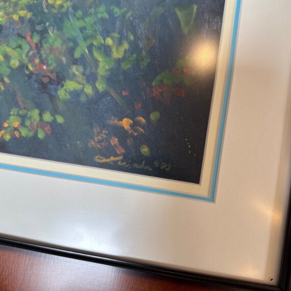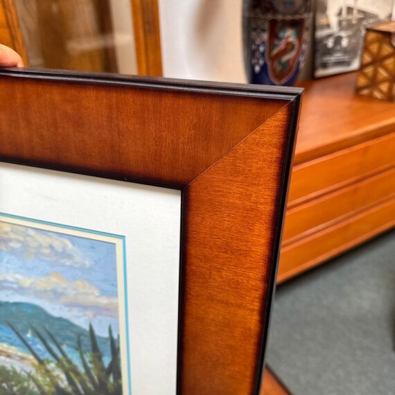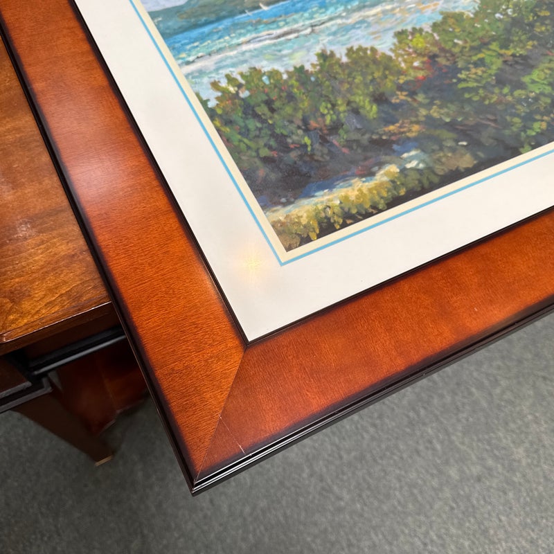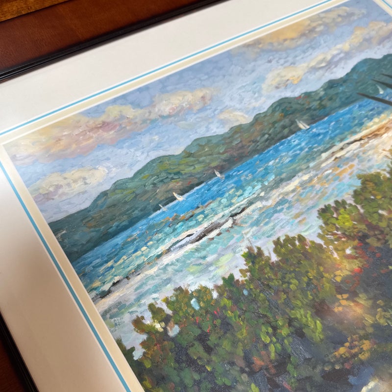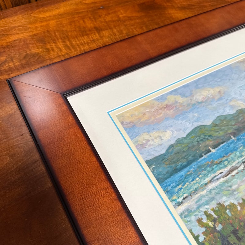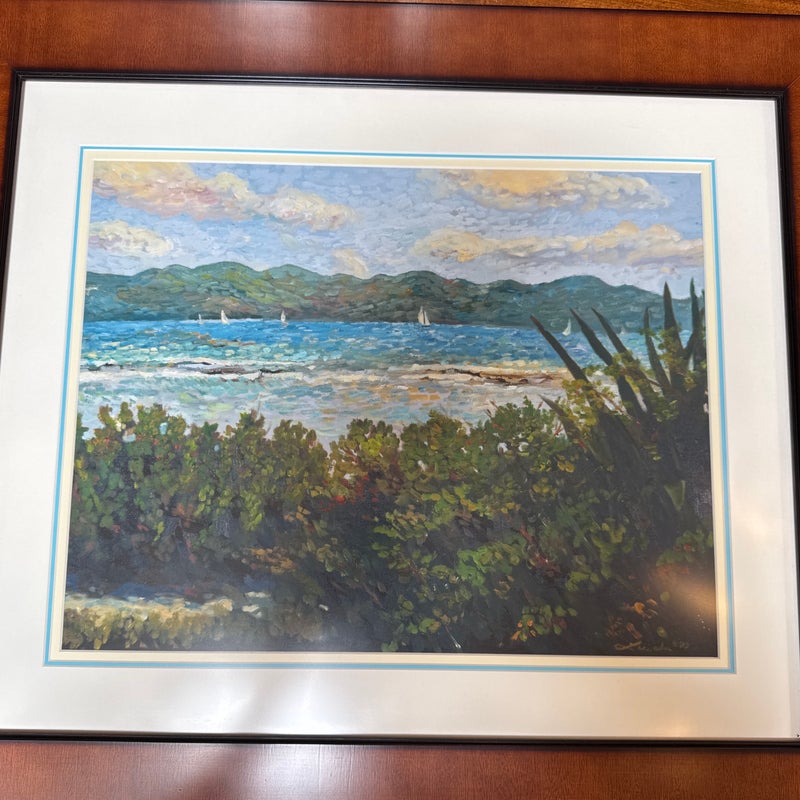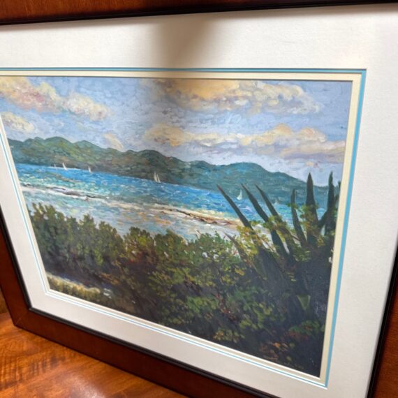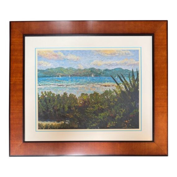 Design Plus Gallery presents a Custom Framed Print “Great Bay View” by Lucinda. A Impressionistic style of the view from The Ritz-Carlton, St Thomas, and the original is in the artist’s collection. It is the view which was often painted by Lucinda’s students during the classes she held weekly. Custom framed in a medium tone wood finish. In good condition, minimal wear.