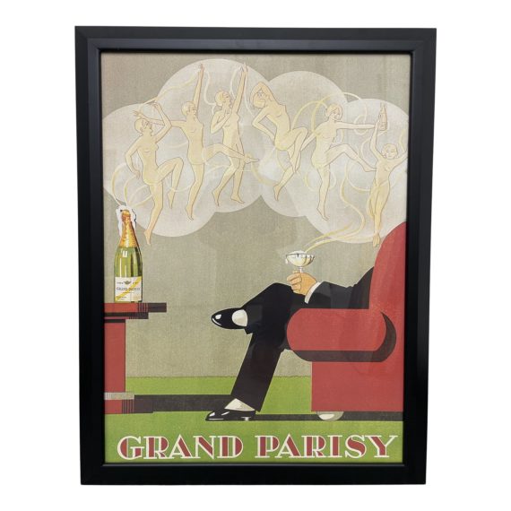 Design Plus Gallery presents a Custom Framed Vintage French “Grand Parisy” Poster Print. Vintage French liquor advertising poster shows a whimsical display of champagne bubbles emanating from a bottle with figures dancing across the composition. A metaphor of the times with champagne representing decadence, romanticism and beauty in the Golden Age of LA Belle Epoque. Poster is framed beautifully with a simple and graphic black wood frame. Minor wear through out, art piece is in good condition.