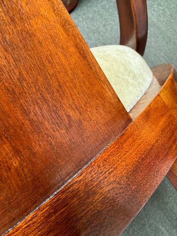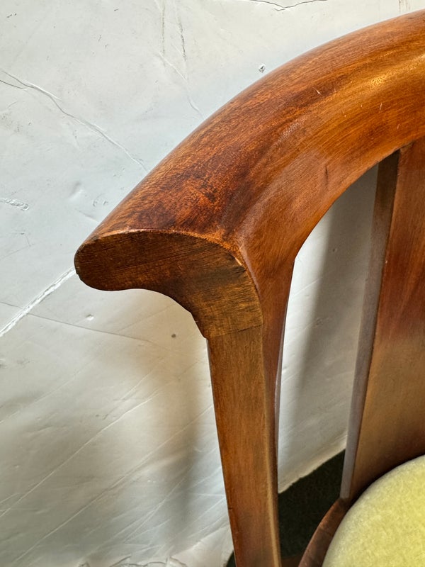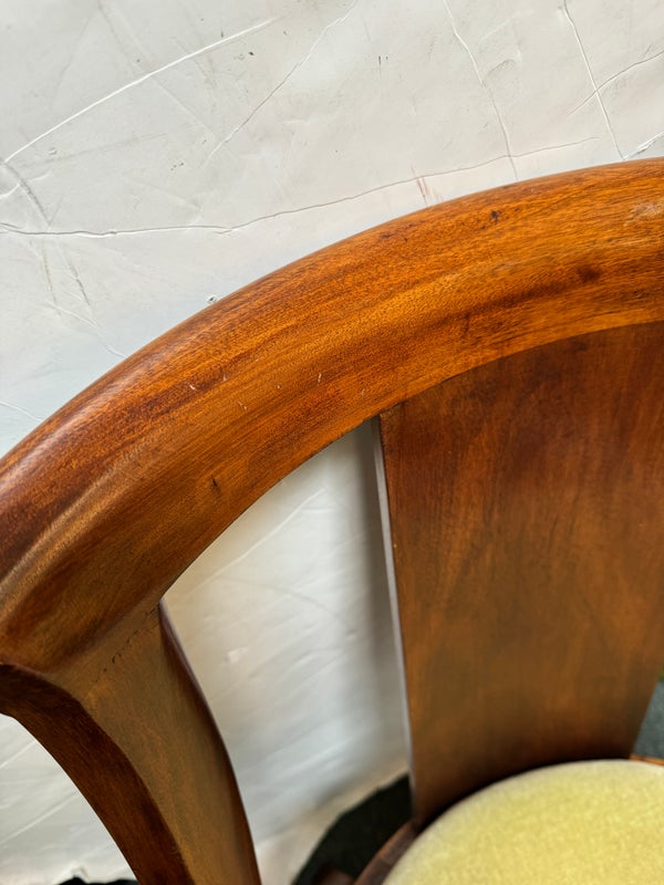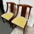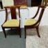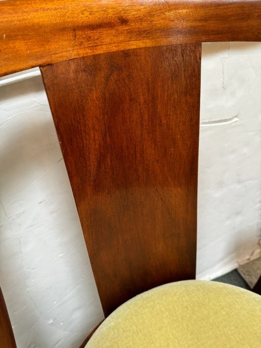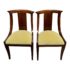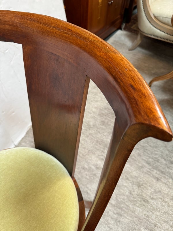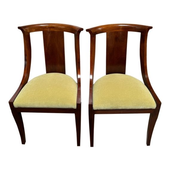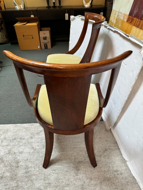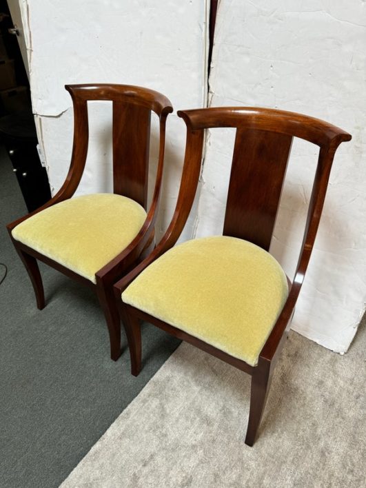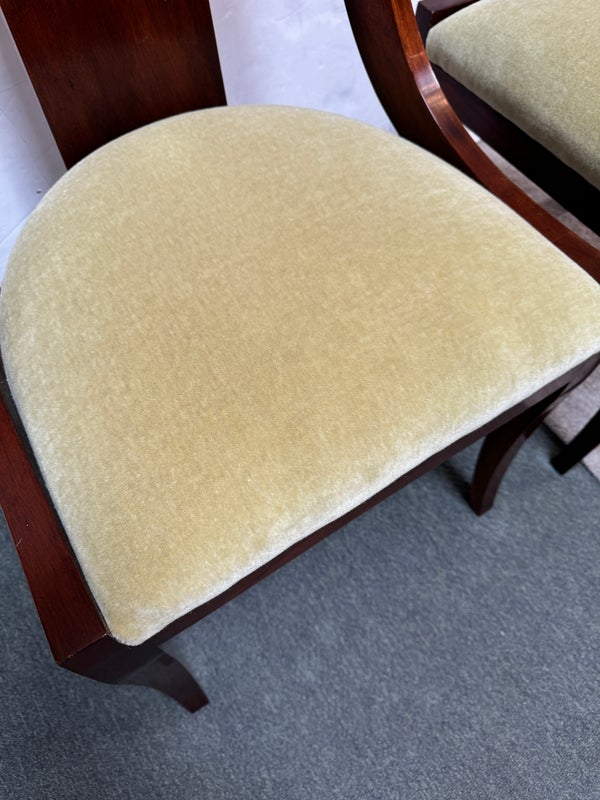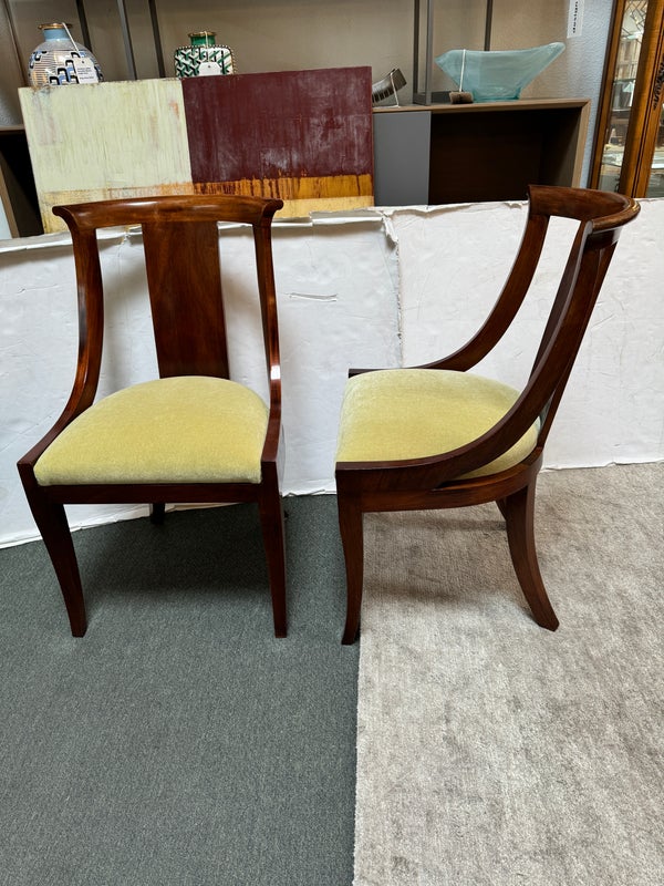 Design Plus Gallery presents a pair of Reproduction Dining Chairs. Beautifully hand-crafted from solid wood showcasing classic French Empire subtlety curved silhouette. The chairs have been professionally upholstered in chartreuse mohair fabric. Solid and stable with excellent joinery and craftsmanship. Light surface wear; condition is good for age and use.