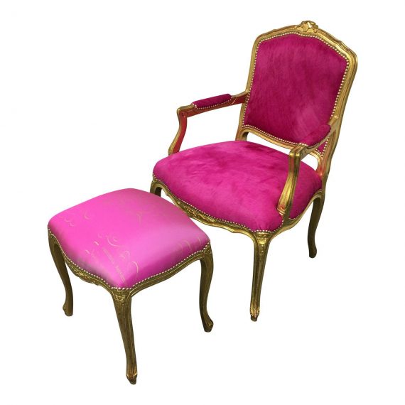 Custom Fuschia Color Upholstered Gold Leaf Chair and Ottoman
