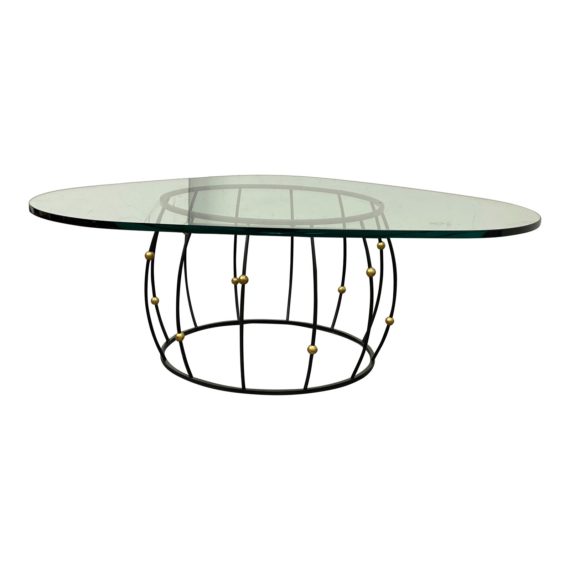 Design Plus Gallery presents a Glass Top Coffee Table. This unique piece features a striking organically shaped glass top sitting atop a wrought iron base with a gold beaded finish. Its modern style gives your home a touch of glamour, while its curved silhouette adds a hint of playfulness. Plus, its durable construction ensures that it will last for years to come. In good condition, wear consistent with age + use.