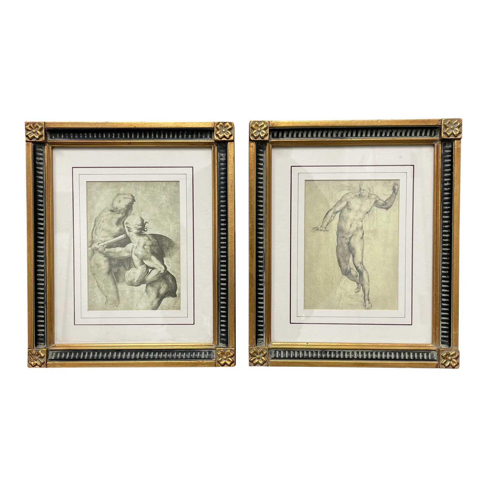 Design Plus Gallery presents a pair of Custom Gold Gilt Framed Michelangelo Reproduction Figure Drawings. This pair of small scale reproductions shows two famous figure studies from the artist. Framed beautifully in gold gilt and black wood frames with neoclassical detailing. Minor wear, good condition.