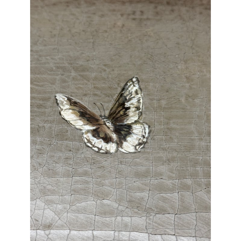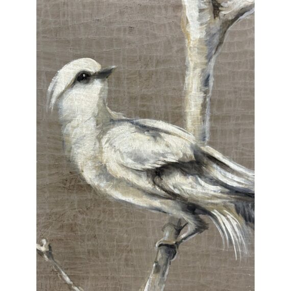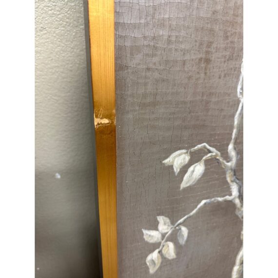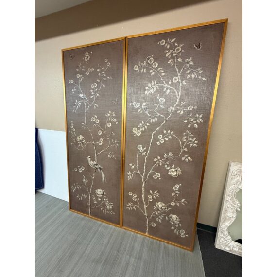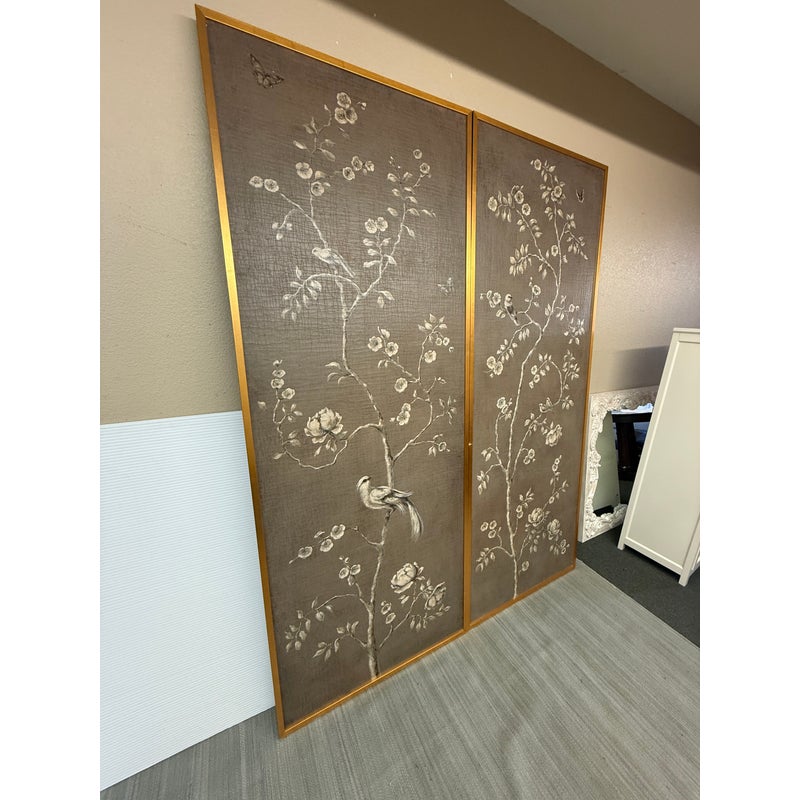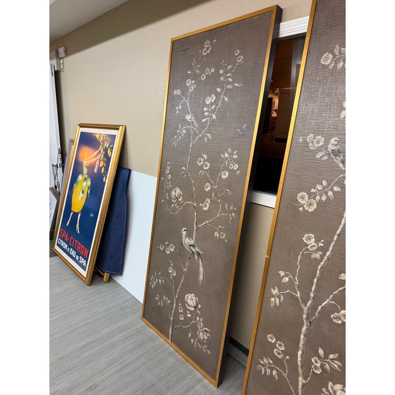 Design Plus Gallery presents a Custom Pair Wall Paper Panels. Each of the panels is hand-painted in a glorious flowering vine and bird motif in a monochromatic pallet, against a crackle taupe backdrop. Delicately framed in gilt painted wood frame with wire for hanging. Little evidence of wear; condition is consistent with age and use.