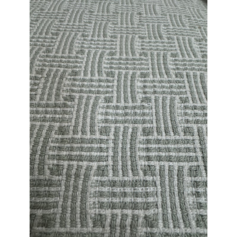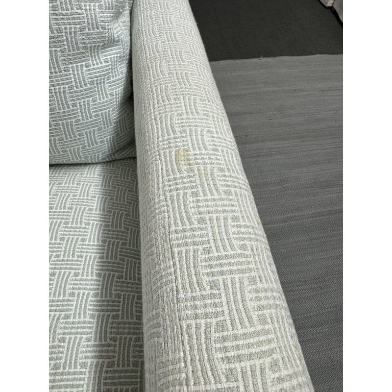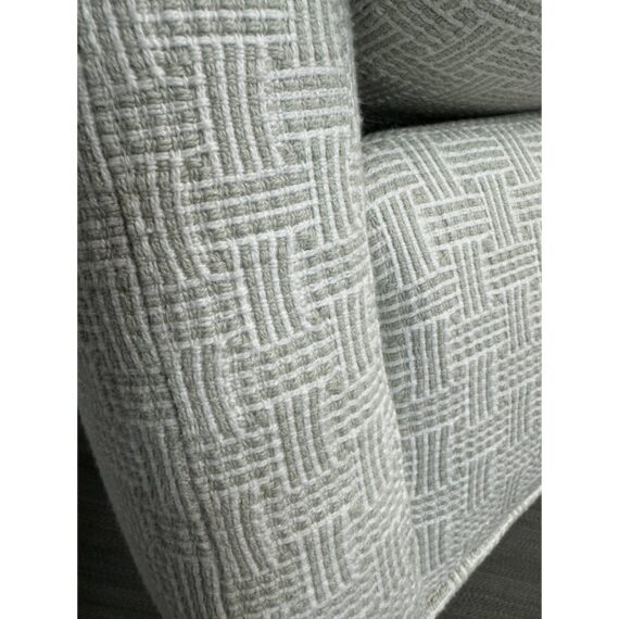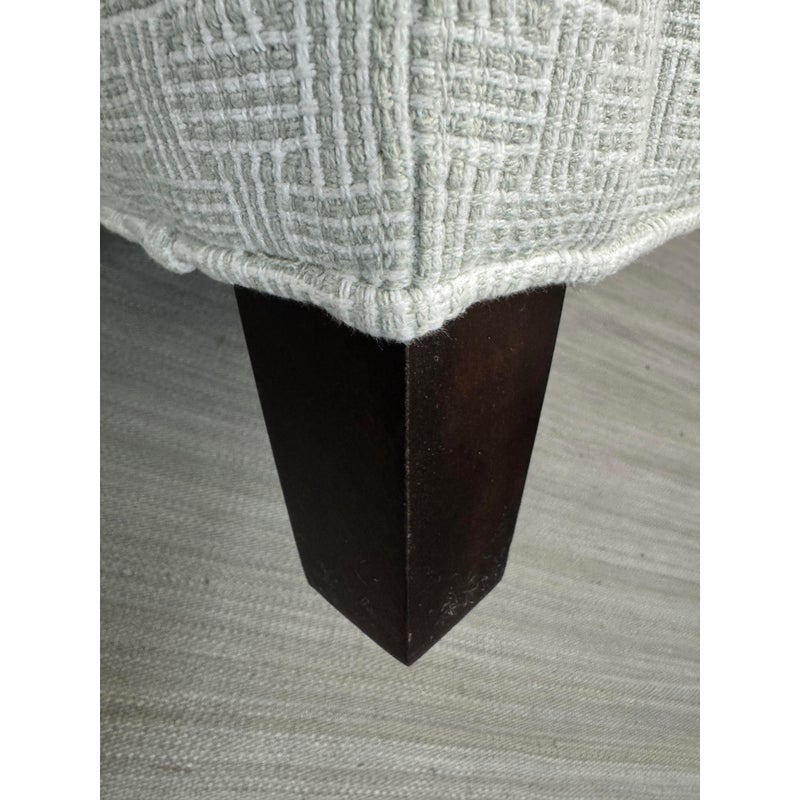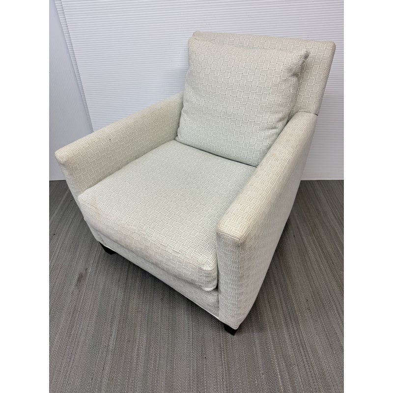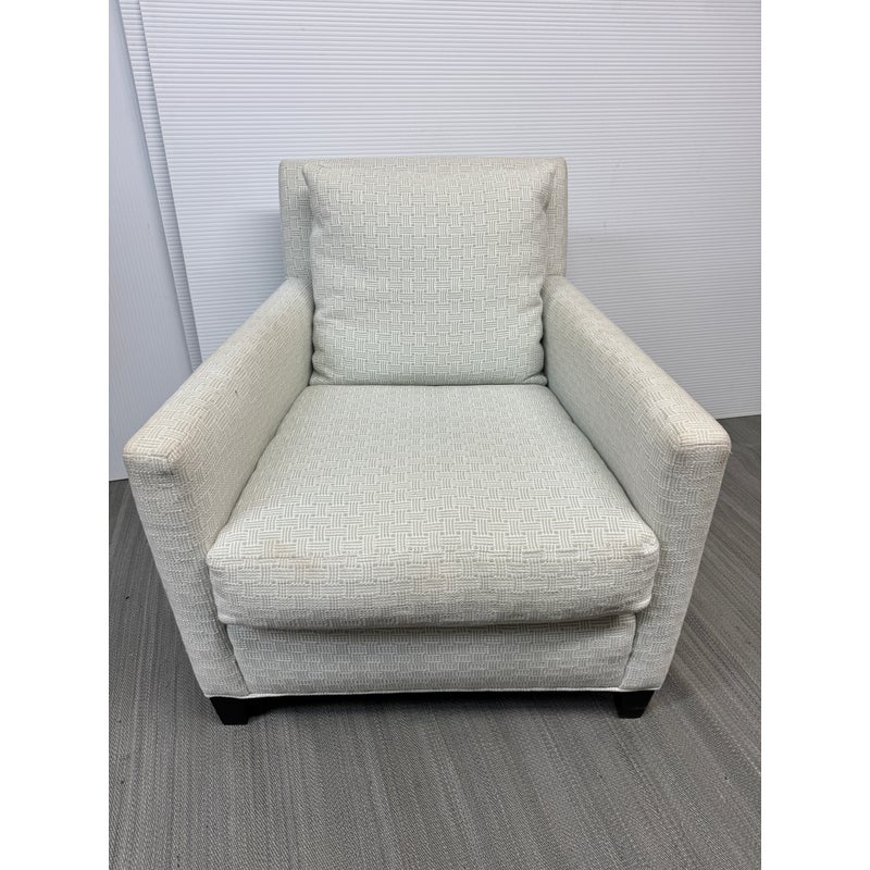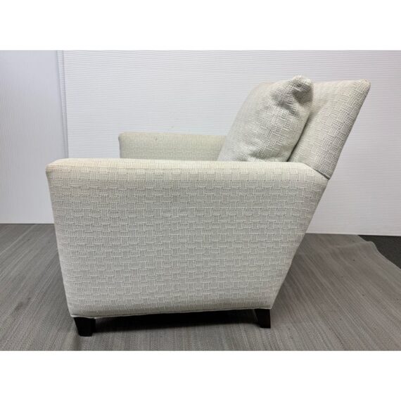 Design Plus Gallery presents a Custom Chair + Ottoman by HMS for Sunrise Home. Simple lines and tone-on-tone subtle texture creates a transitional vibe that works in many decor style. The narrow track arms embrace the loose down wrapped foam seat and back cushions for ultimate comfort. Both are elevated on tapered wood legs. Visible wear and soil; condition is fair for age and use. Made in USA.