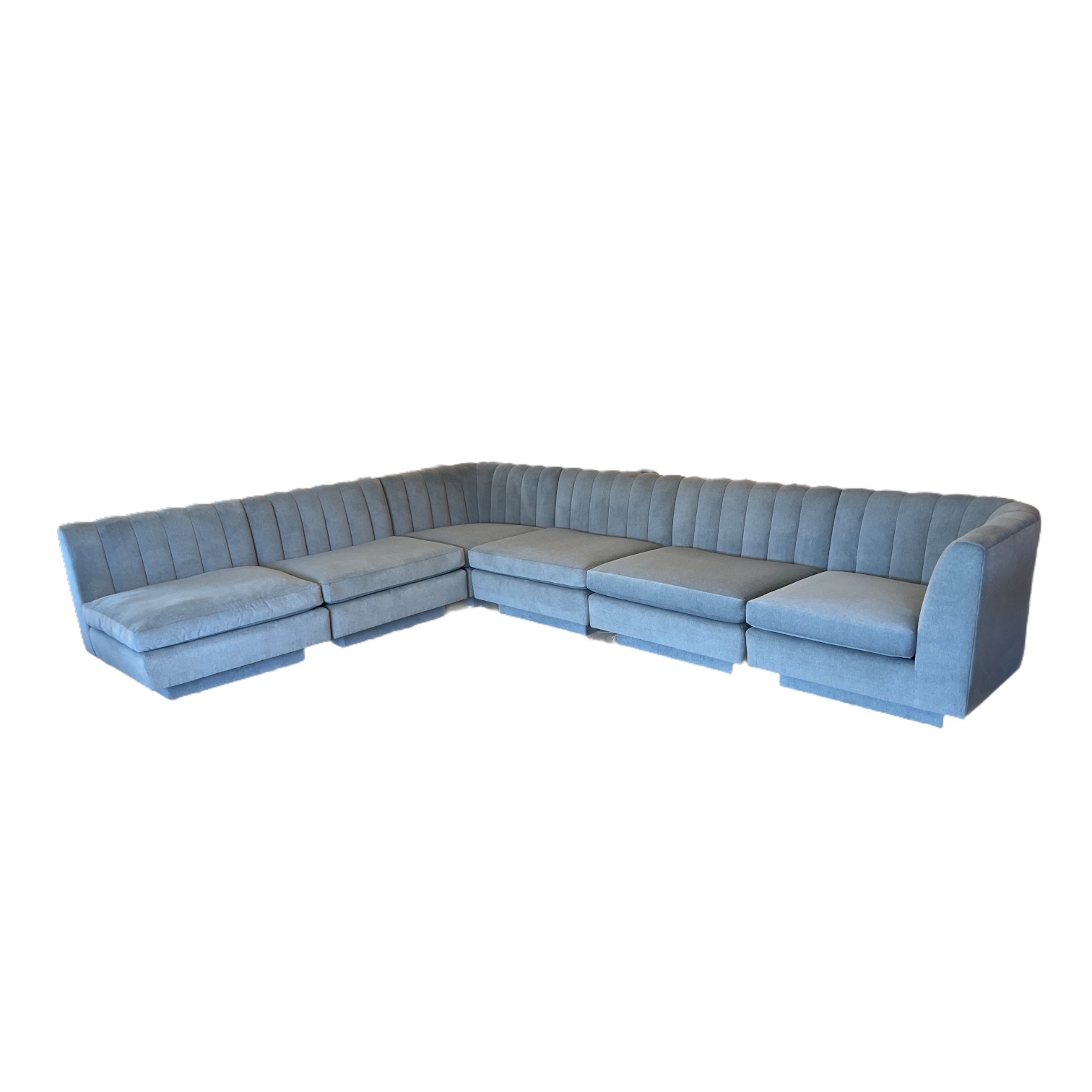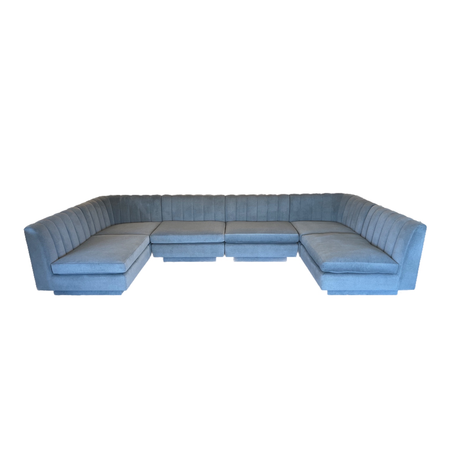 Design Plus Gallery presents a Custom Sectional by Jon De La Cruz. Handcrafted in San Francisco, the six piece channel-back sofa allows for many configurations to fit one’s needs. Upholstered completely in neutral blue/gray performance fabric with a soft hand, each set cushion is down-alternative* wrapped foam for comfort and durability.