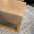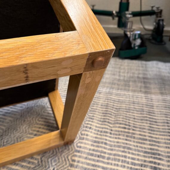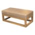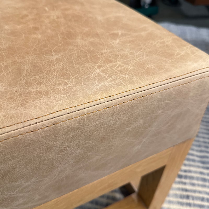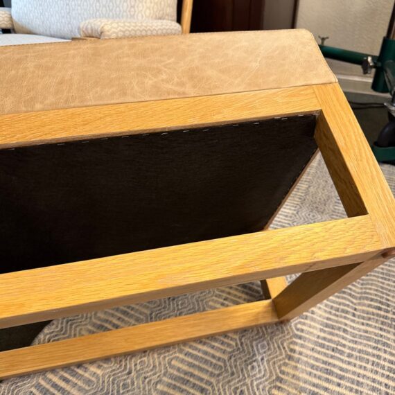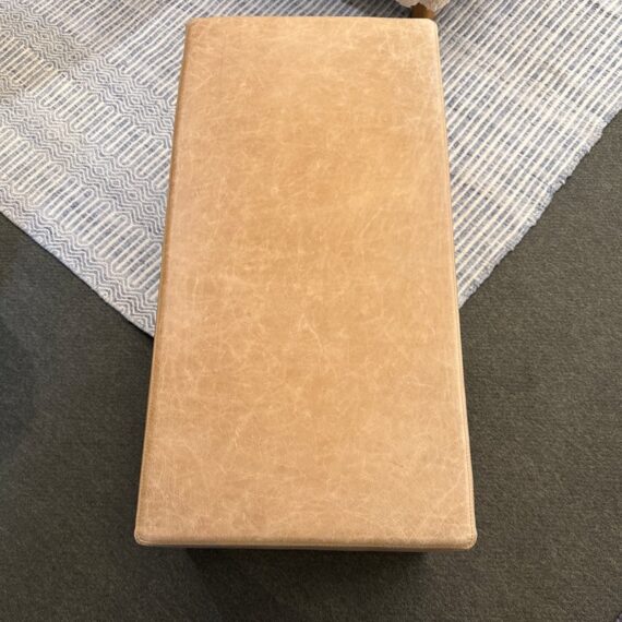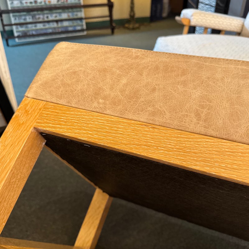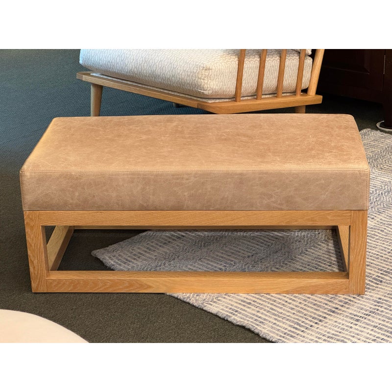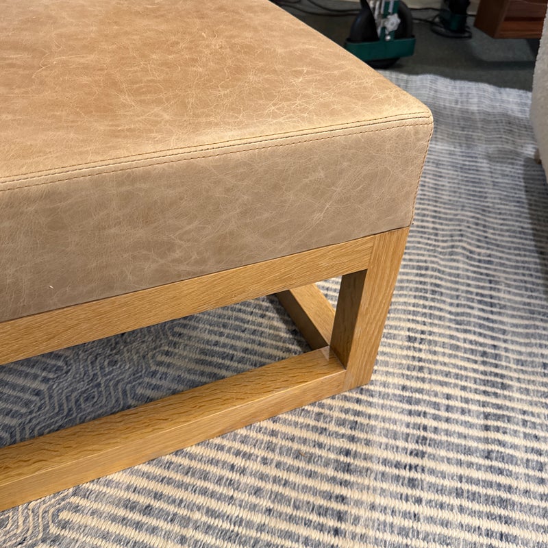 Design Plus Gallery presents a Custom Leather Ottoman. The simple silhouette, in natural oak, creates a clean lined platform for the thickly cushioned ottoman. Distressed tan leather wraps the cushion and is detailed with top stitching. Light wear; condition is good.