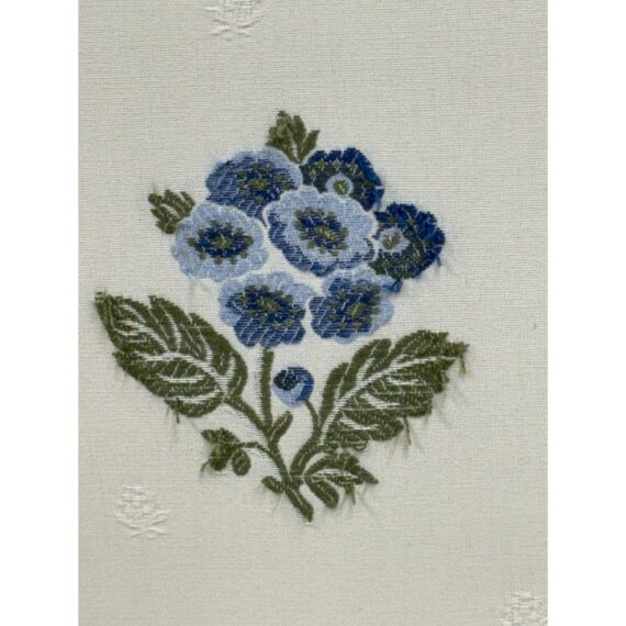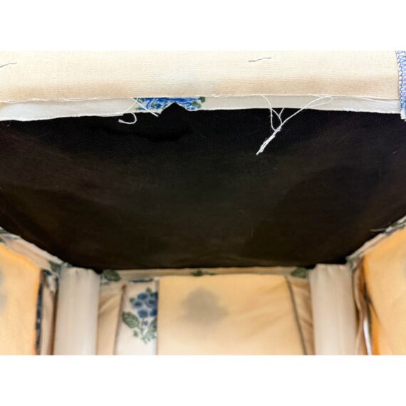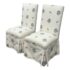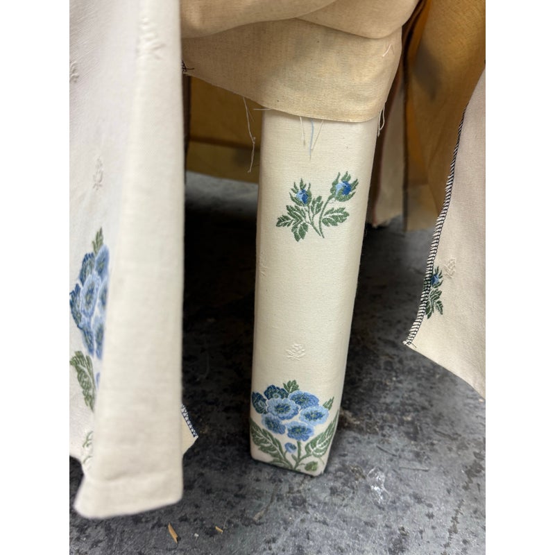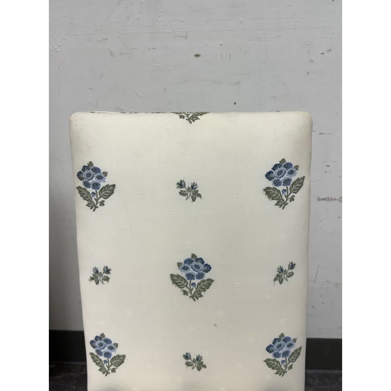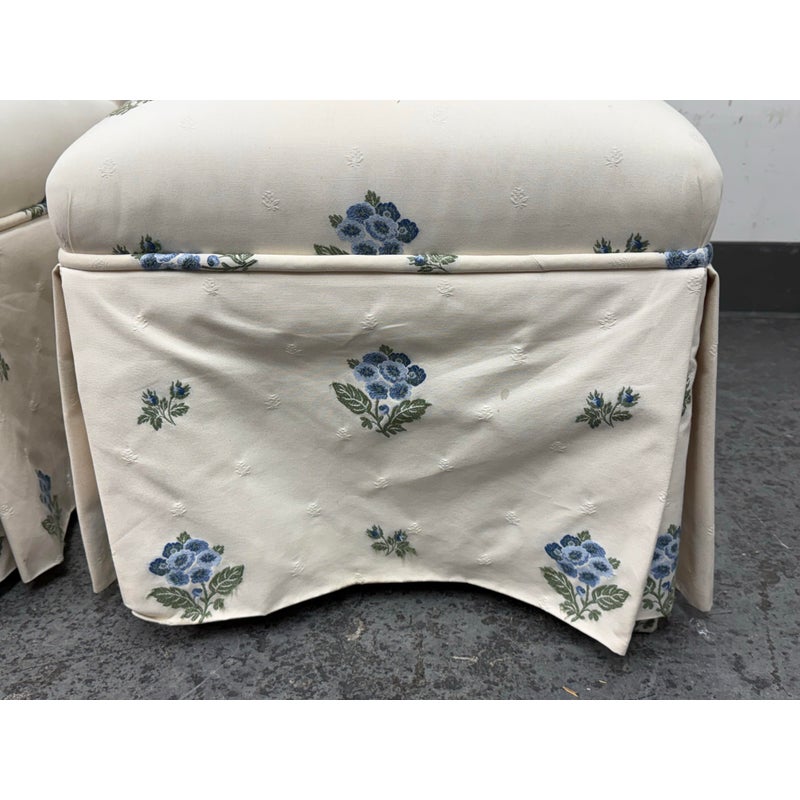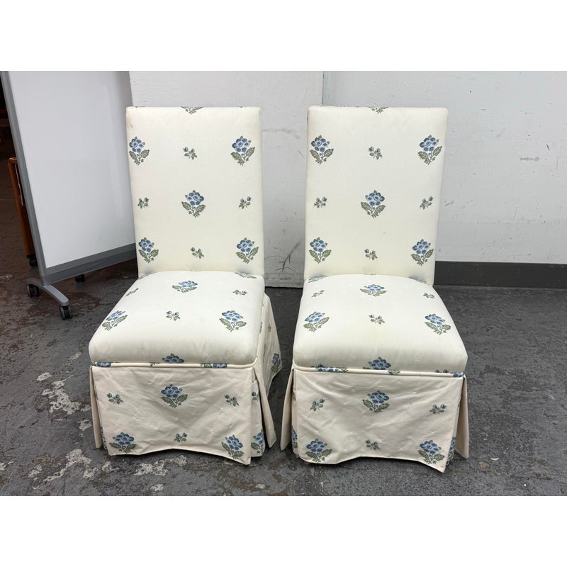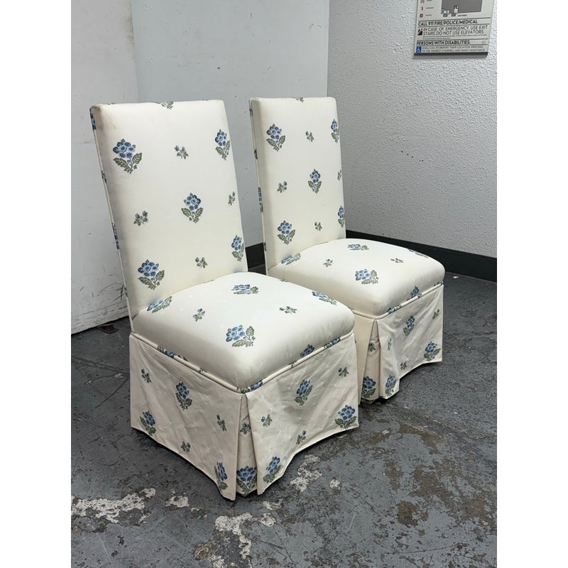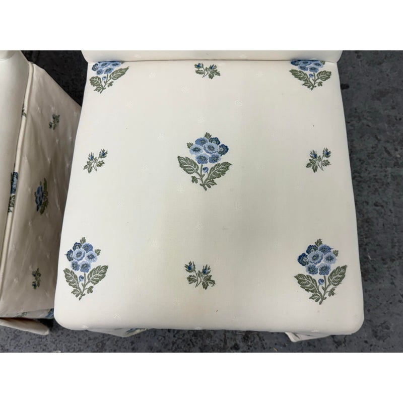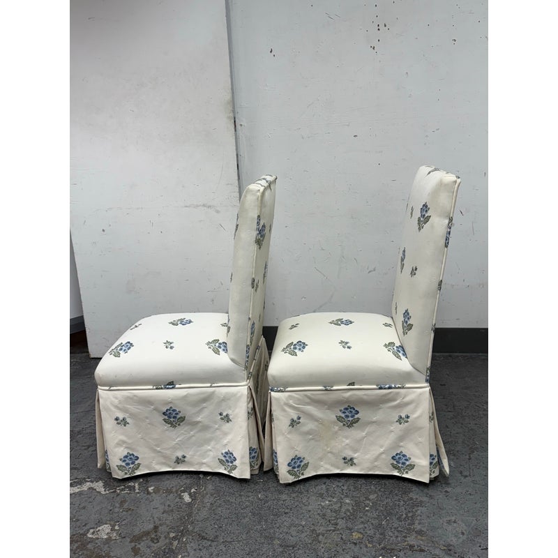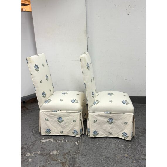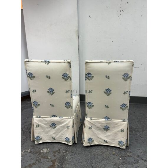 Design Plus Gallery presents a Pair of Blue Bouquet Floral Print Dining Chairs of Custom Make. The have a look of slipper chairs but do have four legs, also fabric wrapped, that are covered by a skirt of the same cotton sateen. The print is diving with a bouquet of blue flowers with green leaves in repeating and alternating in size. They are in good condition for their vintage age with some visible surface wear that is consistent with use.