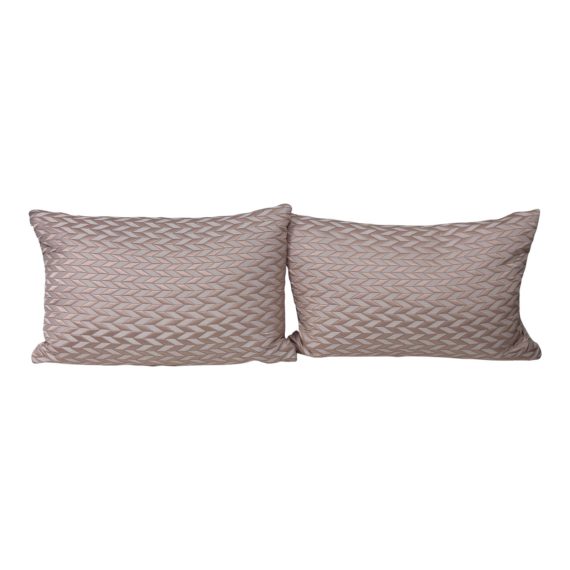 Design Plus Gallery presents a Pair of Designer Pillows of Custom Design. The lovely pillows are high end fabric in a blush pink tone with a chevron pattern, front to back, using silk and wool allowing for a magnificent sheen. Both are in good condition as were only used in home staging