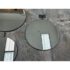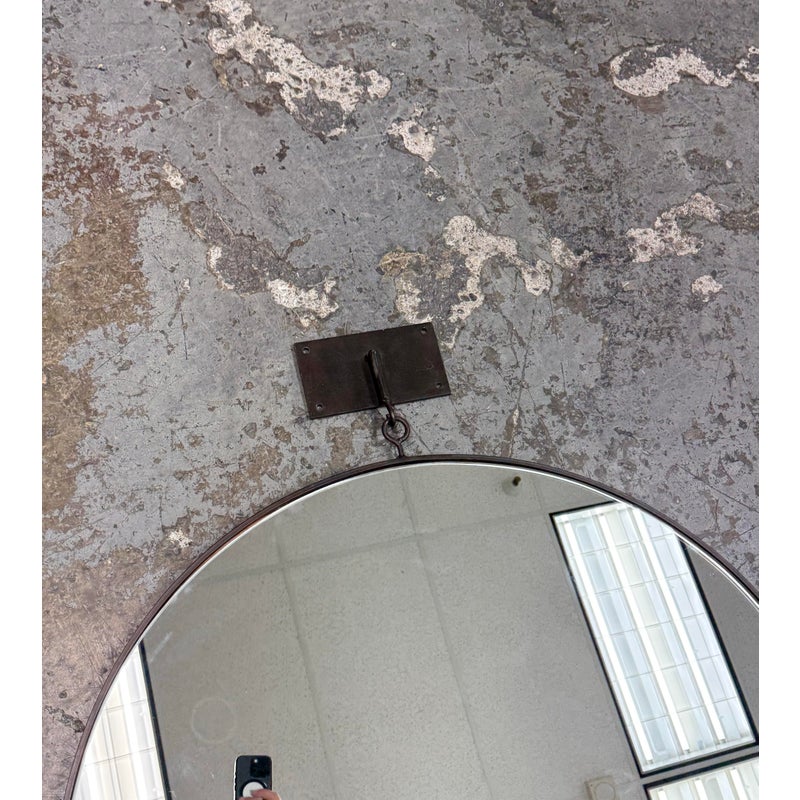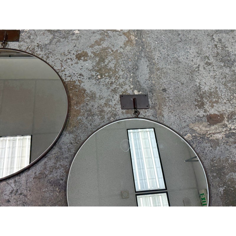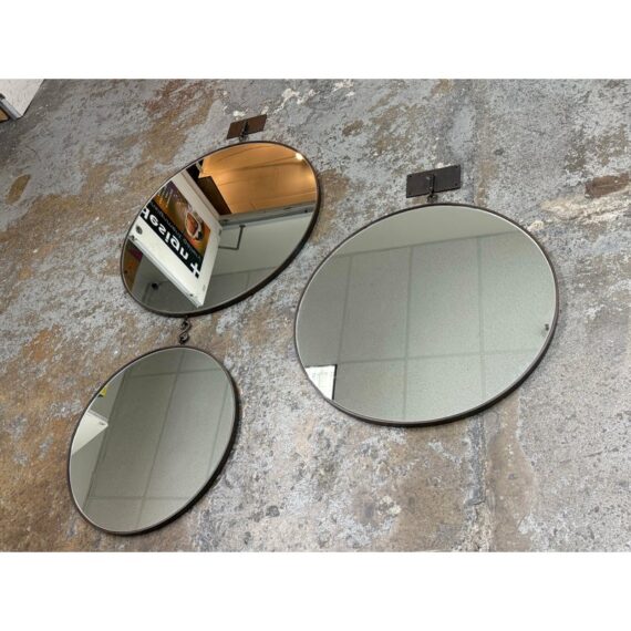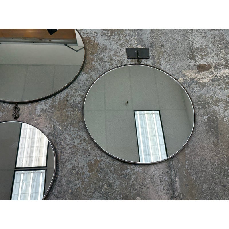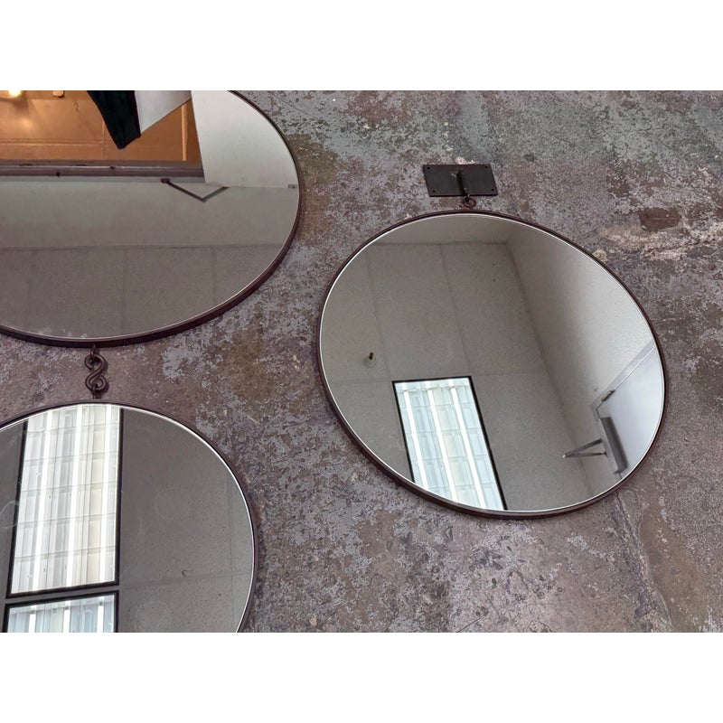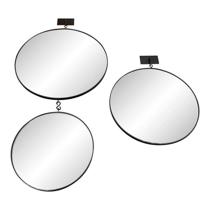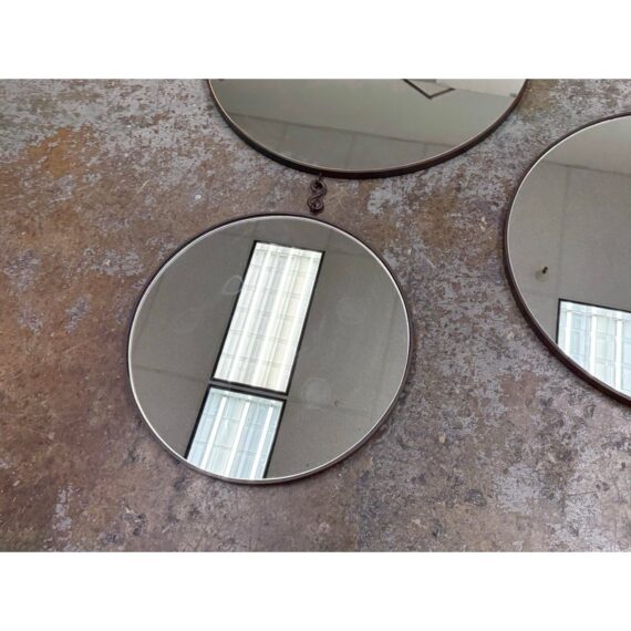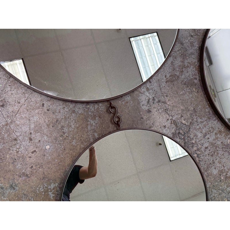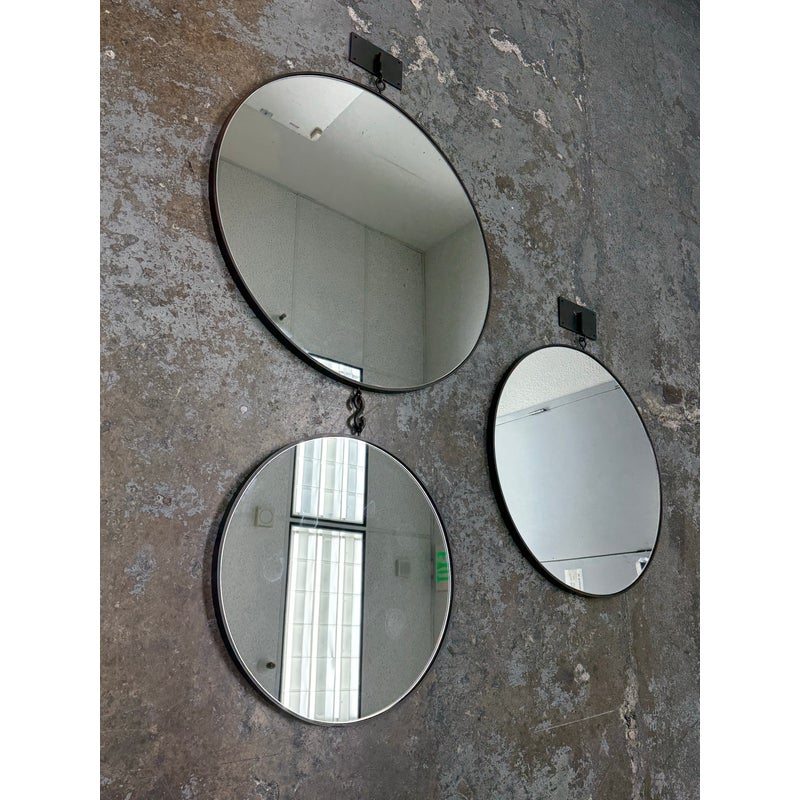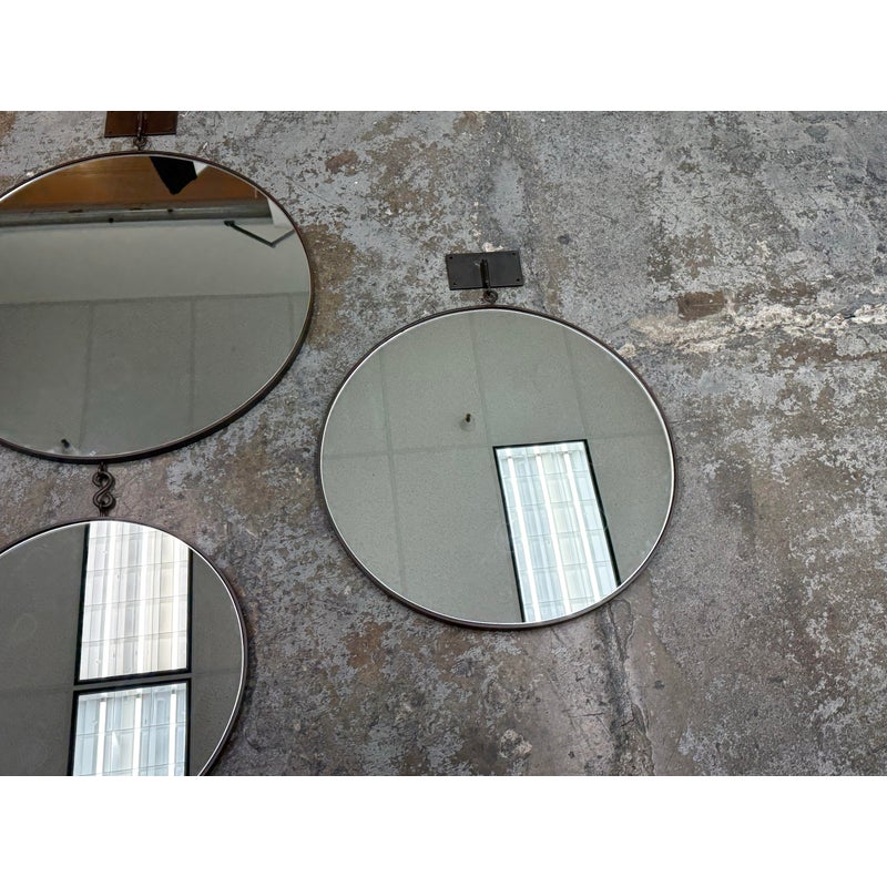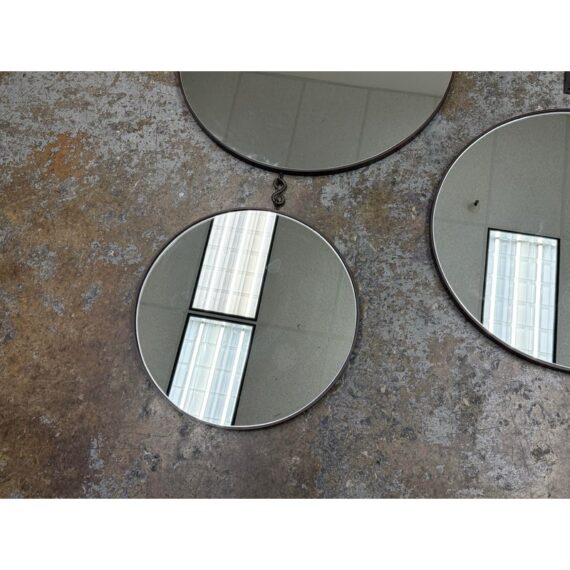 Design Plus Gallery presents a Set of Three Circular Wall Mirror of Custom Make. You can tell that this set is well made of impressive materials for a captivating installation on a wall. The larger one with the smaller one are attached by a chain link with the medium size available to place at your discretion. The mirrors are all in good condition for their usage.