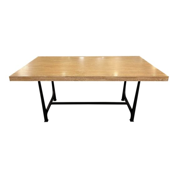 Design Plus Gallery present the Custom Design Oak Dining Table. Features include a rectangular oak tabletop and an iron base with a black coat finish. The light grains offer a subtle whitewash appearance. Minor wear from use; table is in good condition.