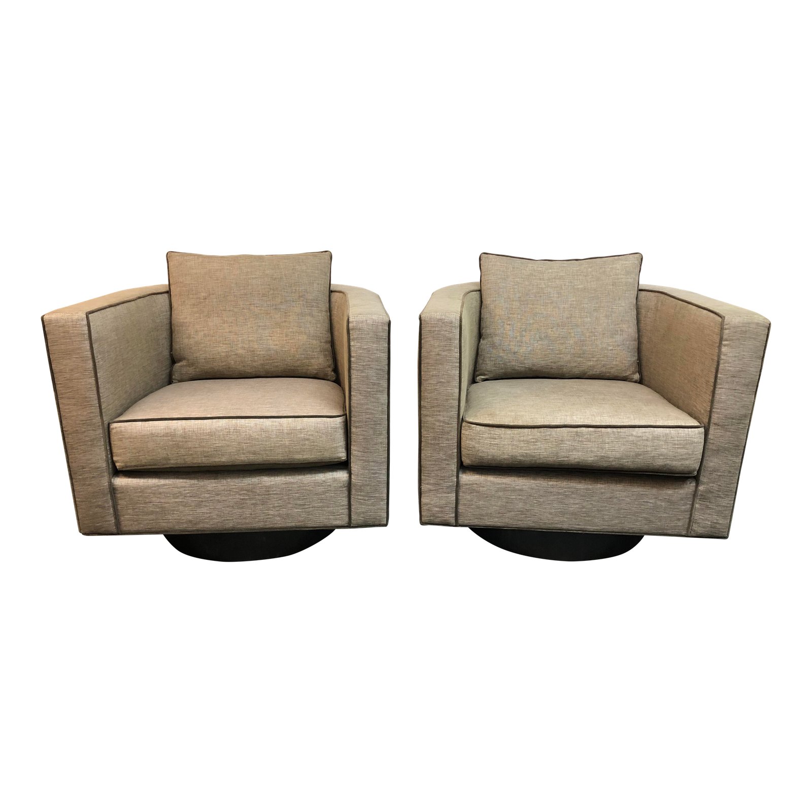 Design Plus Gallery presents a custom pair of swivel chairs from Steven Anthony Inc. Manufactured using environmentally friendly materials, the pair of comfortable chairs has you looking good in every direction A lovely neutral tweed covers the chairs, while a soft gray welting defines the simple barrel-back silhouette. Loose back cushions.