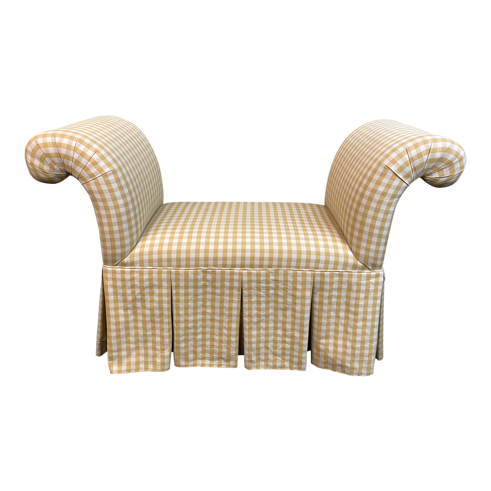 Design Plus Gallery presents a Custom Bench. The large rolled arms lends a whimsical air to the gold and off-white gingham seat, while the lined and pleated skirt adds refinement. Dark stained tapered legs hide beneath the skirt. Perfect in hallway or at the foot of the bed.