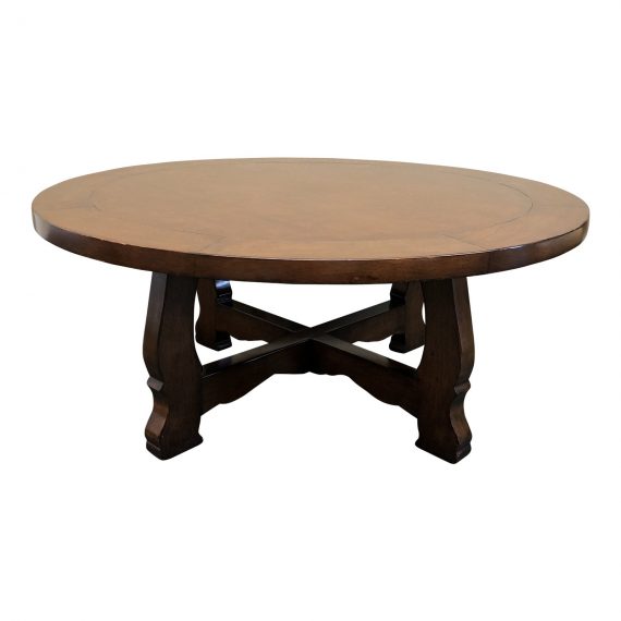 Design Plus Gallery presents a Custom Round Cocktail Table. French Country details include wide plank surface, rustic finish and scalloped base.