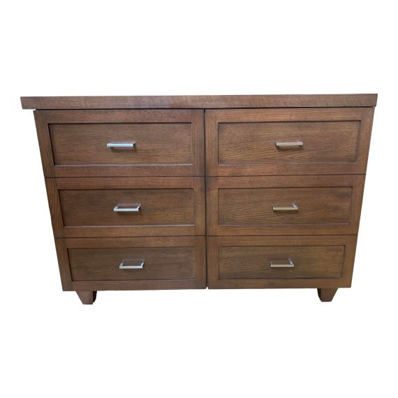 Design Plus Gallery presents a T. Woodcrafts Rift Sawn Oak Storage + Shelving. Cerused finish contrasts the grain with the rich walnut stain on the Oak Veneer. Four optional shelves are available to setup storage which suits your needs. Sleek brushed steel hardware contrasts wood and gives nice repetition including an inset shaker style molding. Minor wear on frame. Plenty space to store the necessities you don’t want to display.
