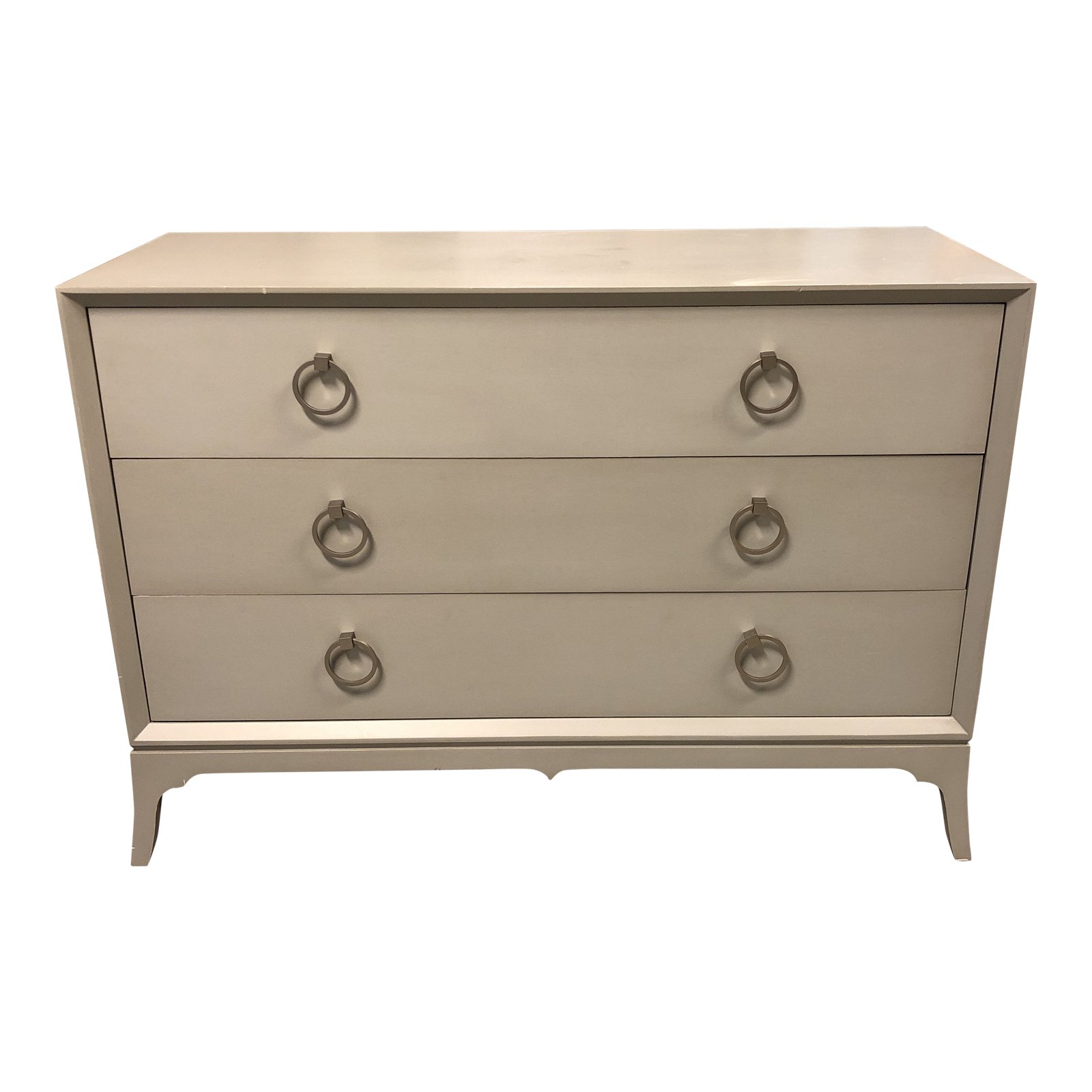 Design Plus Gallery presents a Custom Three Drawer Dresser. Crafted from solid woods and veneers. The finish is a Dove Gray, minor wear on frame. The hardware are circle metal pulls in a brushed nickel finish. A contemporary and elegant design. Suitable for the bedroom, dining room or office.