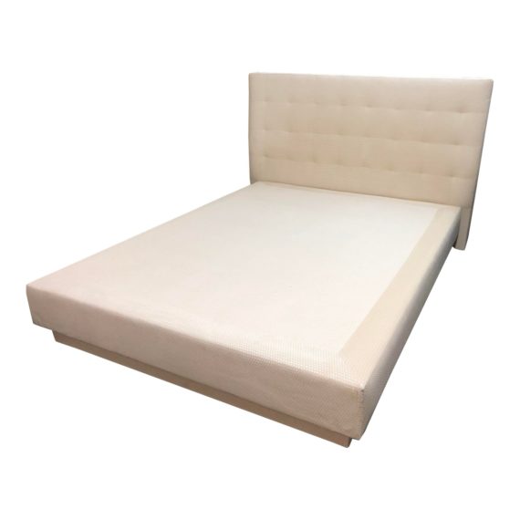 Design Plus Gallery presents a custom platform bed. This queen size headboard + base is lightly tufted in a white/off white textured upholstery. Clean lines, like sleeping on a cloud.