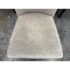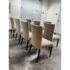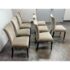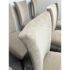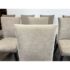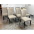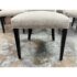 Design Plus Gallery presents a Set of Custom Eight Dining Chairs. Elevate your dining space with this set of side chairs, blending comfort and classic appeal. Features a slightly curved back that offers gentle support, with both seat and back fully upholstered for a polished, tailored look. The soft beige-taupe fabric has a subtle sheen that catches the light and complements a wide range of interiors, from traditional to modern. The armless silhouette tucks easily under most tables, while black-finished legs ground the design. Legs show natural wear from regular use, adding a touch of lived-in character without compromising stability. In good condition, visible and minimal wear from usage.