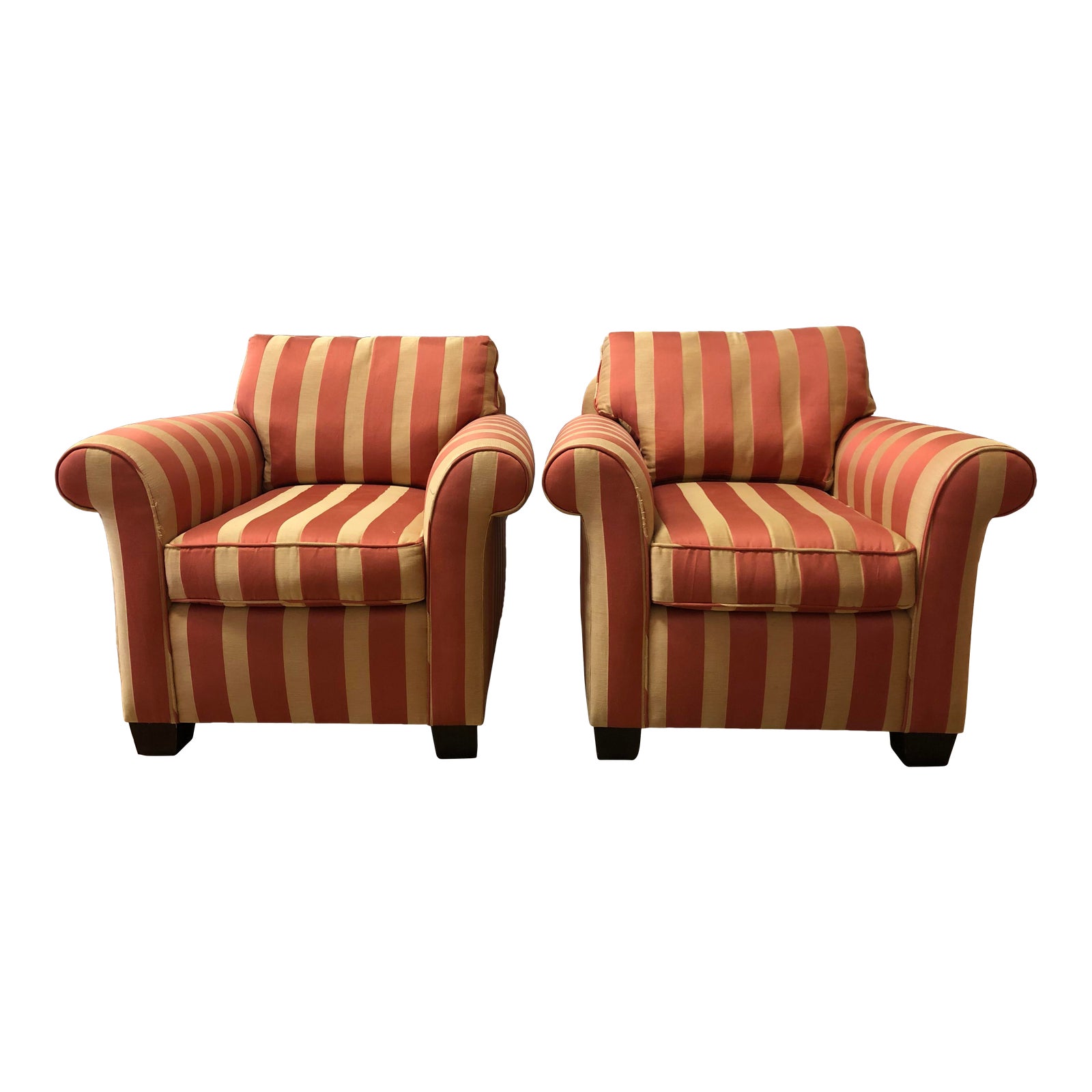 Design Plus Gallery presents a pair of custom arm chairs. Rolled arm frame with a loose seat and back cushions. Upholstered in a gold and red wide stripe fabric. Wood taped feet in a dark finish. Minor wear on frame from usage. Arm height: 26 inches, seat height: 18 inches