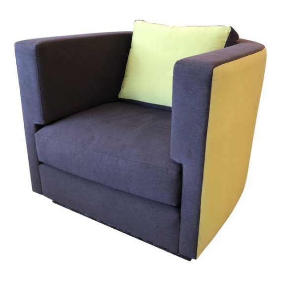 Design Plus Gallery presents a custom upholstered arm chair. This beautiful chair came from Enid Ford Atelier, San Francisco. It has been upholstered in two saturated colors which give the chair visual depth. The outer portion of the chair is upholstered in acid Green and the inner is a contrasting Charcoal Gray. The swivel as well as the detail on the back are a rich woodgrain. The chair also comes with a matching decor pillow. The chair is extremely comfy!