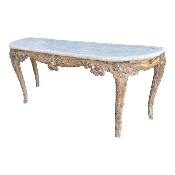 Design Plus Gallery presents a Vintage Console Table. Silky bull nosed travertine top crowns the elaborately carved Faux Bois base, with a light wash. Elegant and unusual with leaves as a grand garland around the apron. Light evidence of surface wear, consistent with age and use.