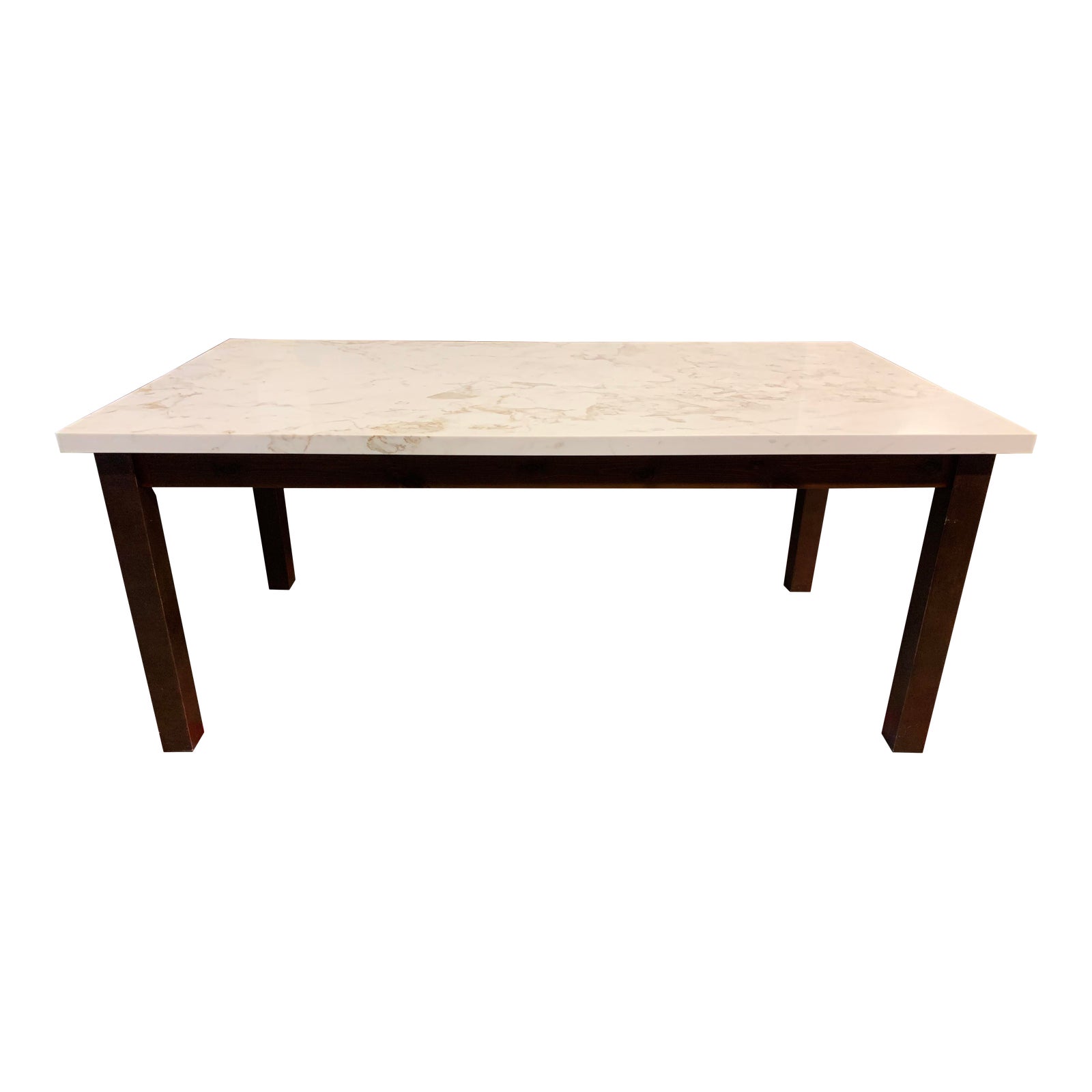 Design Plus Gallery presents a Custom Table. A white marble slab with natural grains forms an elegant and clean design for your space. The marble sits on a custom parson’s style wood base in a dark finish. Suitable for the dining room or office.
