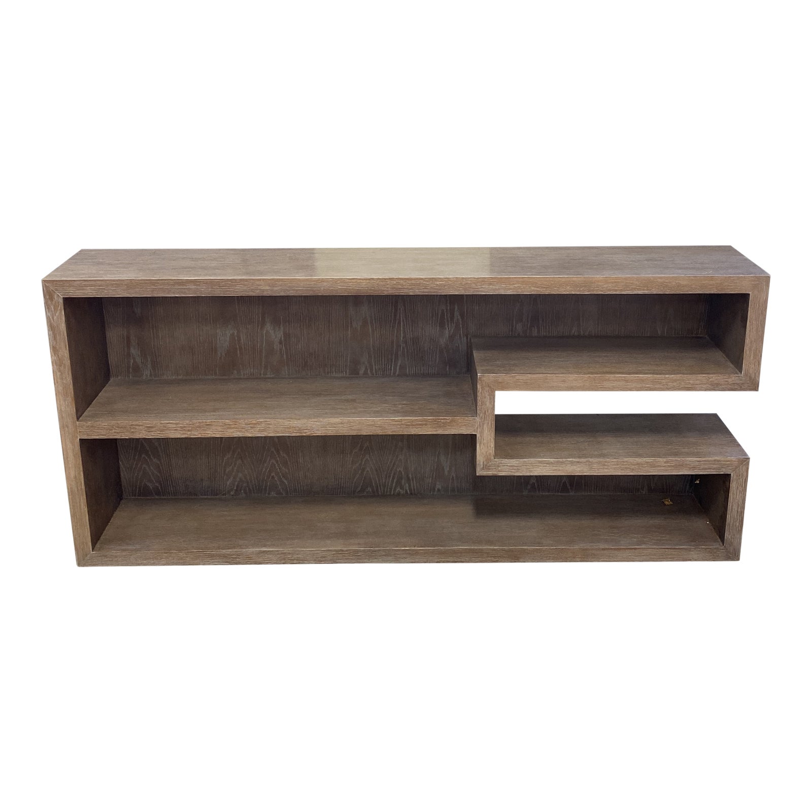 Design Plus Gallery presents a Custom Bookcase. Solid wood construction is beautifully finished with a satin stain on a cerused taupe wood grain. Right side of unit is unfinished and has hardware which was originally meant for wall connection. Unique cut out on right face of unit is open to the back and would be convenient for electrical or media output. Long and narrow proportion is ideal for small spaces or corridor needing display + storage space. Minor wear on surfaces.