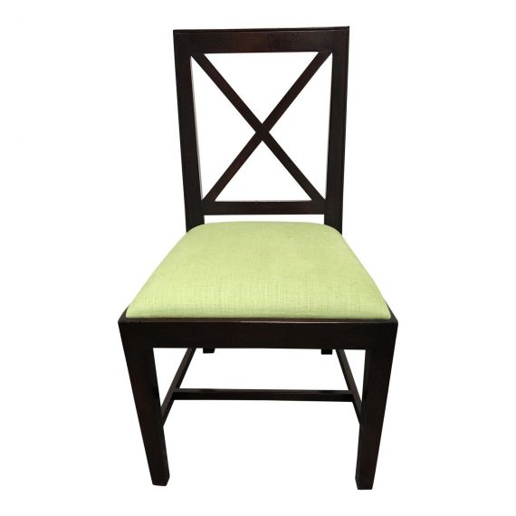 Design Plus Gallery presents a custom upholstered side chair. Upholstered in a sage green fabric. The frame is a X back with a dark brown ebony finish. Custom made for a resident in the Four Seasons of San Francisco. Seat Height: 20 inches.