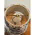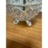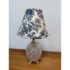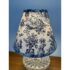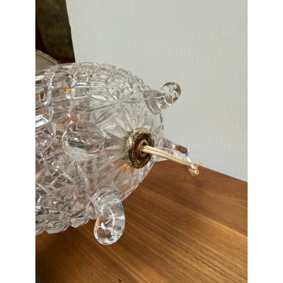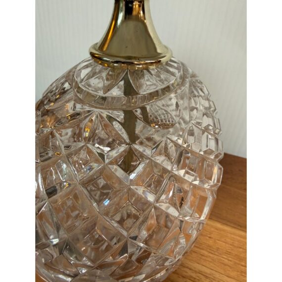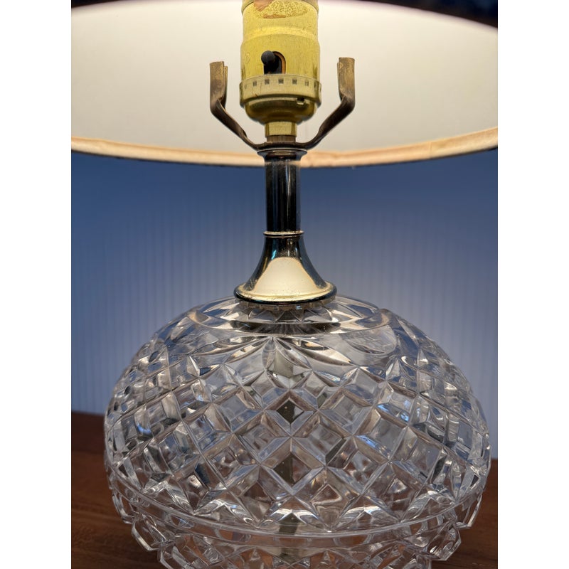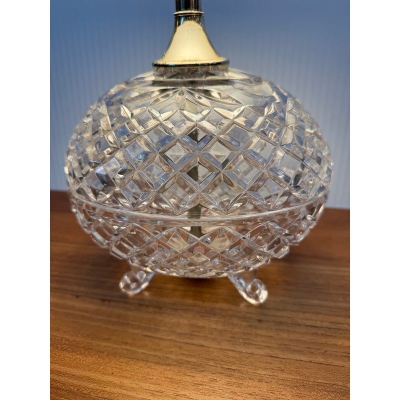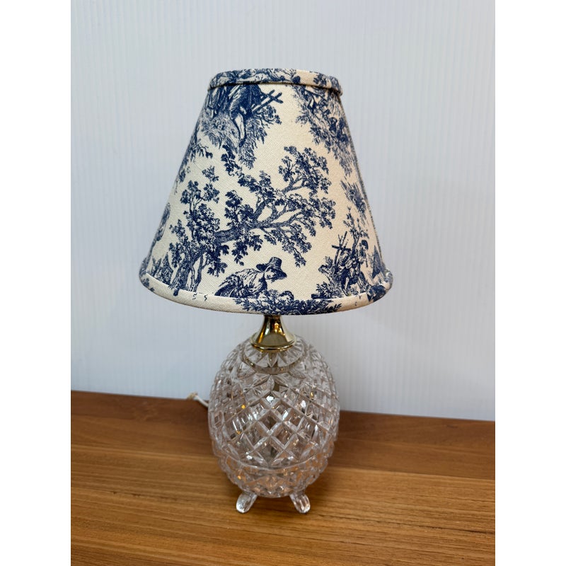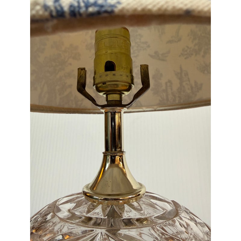 Design Plus Gallery presents a Boudoir Cut Glass Table Lamp. The lamp has distinctive egg-shaped cut glass with a diamond pattern. The round body is anchored by cut glass feet for a stylized snail or shell shape. The lamp has a blue + white toile fabric shade and is in good condition for its usage.
