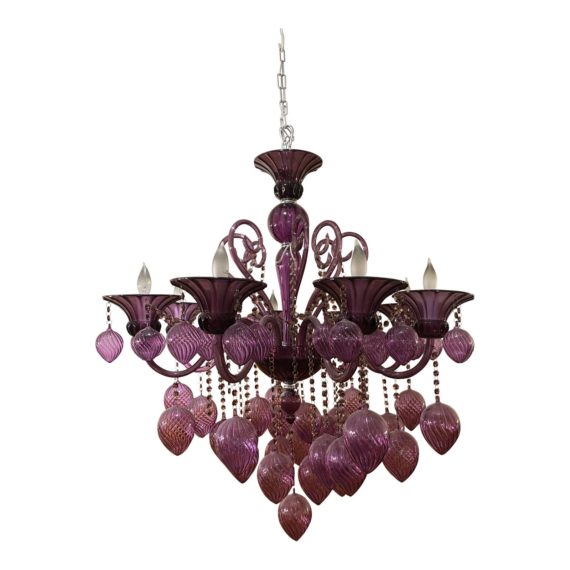 Design Plus Gallery presents a Bella Vetro Chandelier by Cyan Design. The Purple Chandelier makes an eye-catching focal piece in a dining room or entryway. Featuring dangling glass charms, curved arms, and scroll details, this royal purple glass chandelier is sophisticated and striking. UL Type: Dry, Bulb Type: B Type, Number of bulbs required: 8 (bulbs not included), Wattage: 60. Minor wear.
