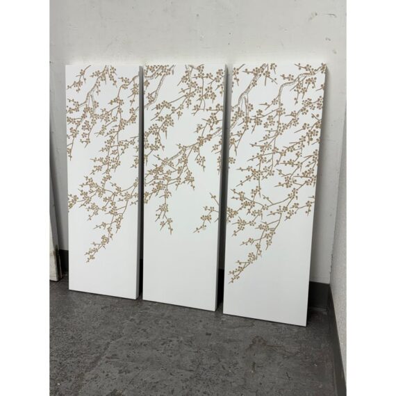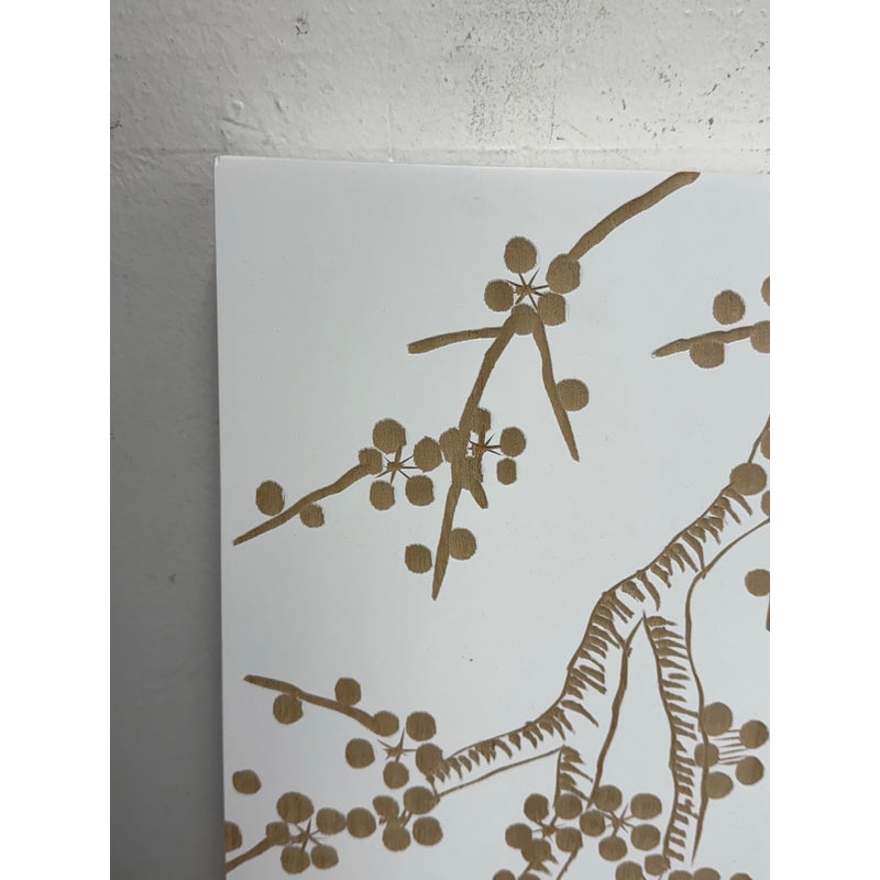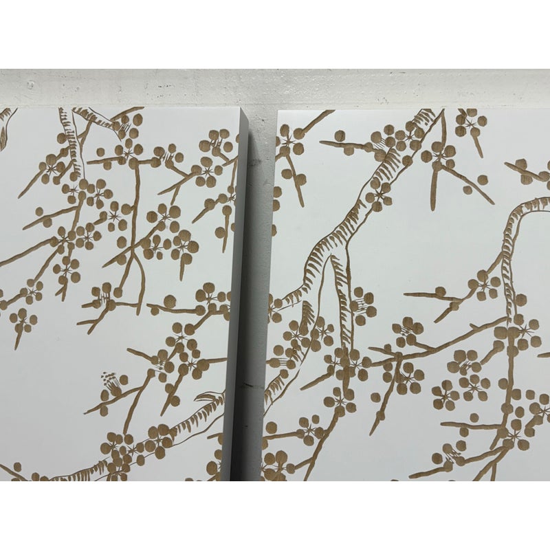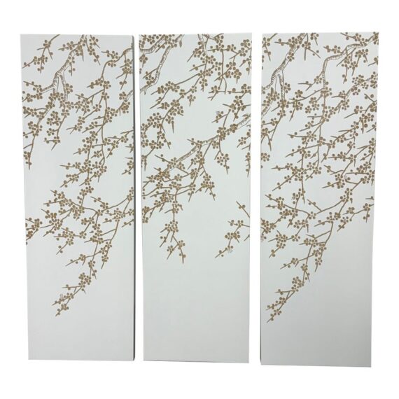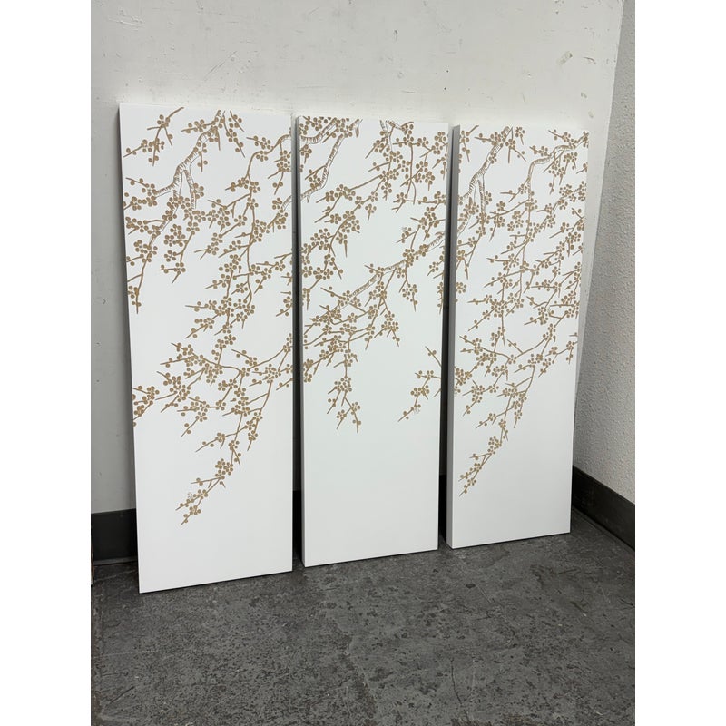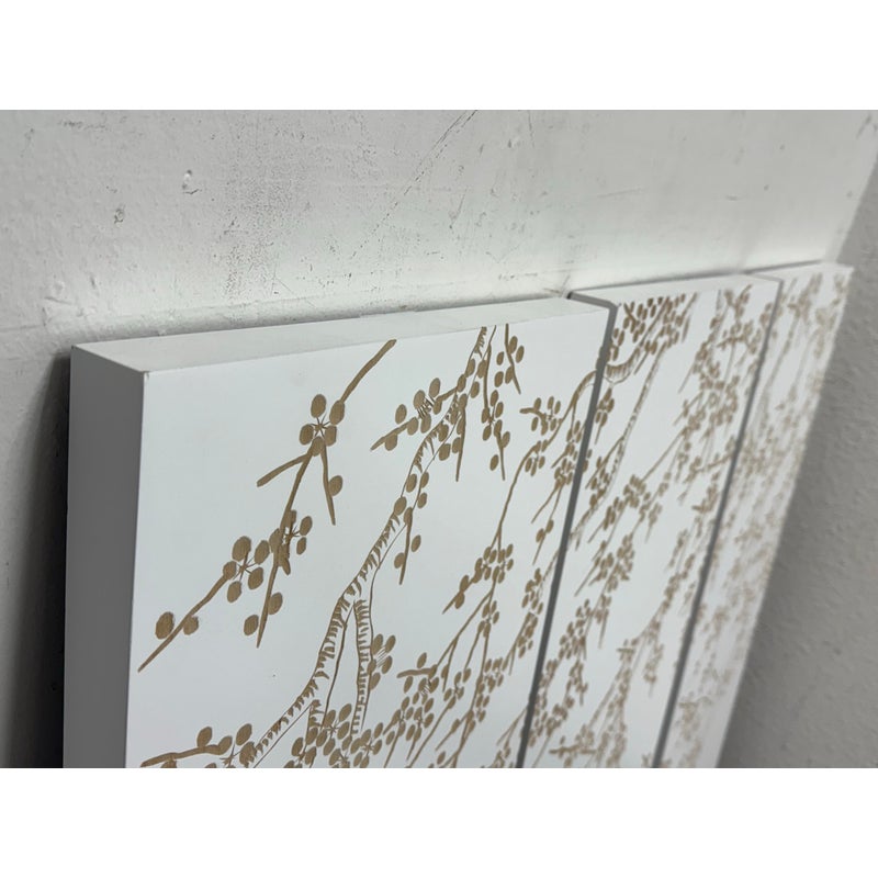 Design Plus gallery presents a Set of Three Cherry Blossom Wall Panels from Cyan Design. The panels will lend an eclectic feel to your home or office. Distinctive and versatile, this unique set is made from natural materials and can be the inspiration for a room, or the finishing touch that perfects it. They are all in good condition with a white background and golden blossoms. The style has been discontinued by the brand. Overall the set is in good condition for their usage.