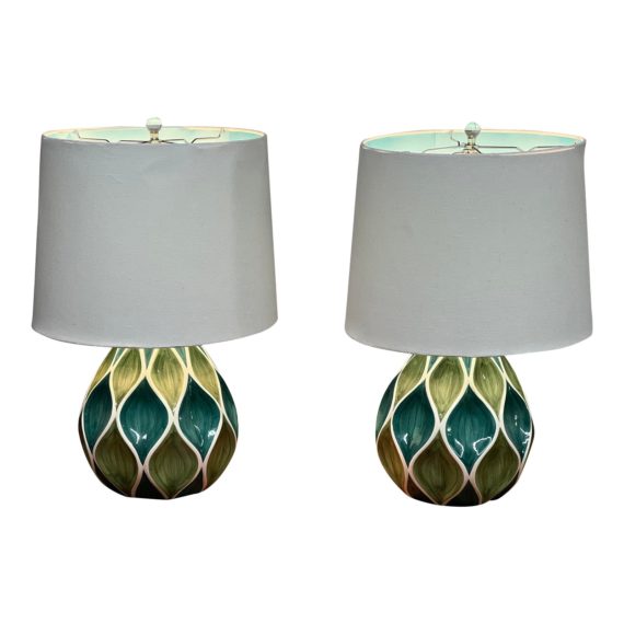Design Plus Gallery presents a Pair of Glenwick Table Lamps by Cyan Design. Glossy white undulations create a graphic pattern on these happy lamps. Colorful green and blue glazes alternate throughout, for a mid-century vibe. Topped with a white fabric shade with a blue lining that glows when the lamp is illuminated. Uses single 100 watt bulb, not inc.