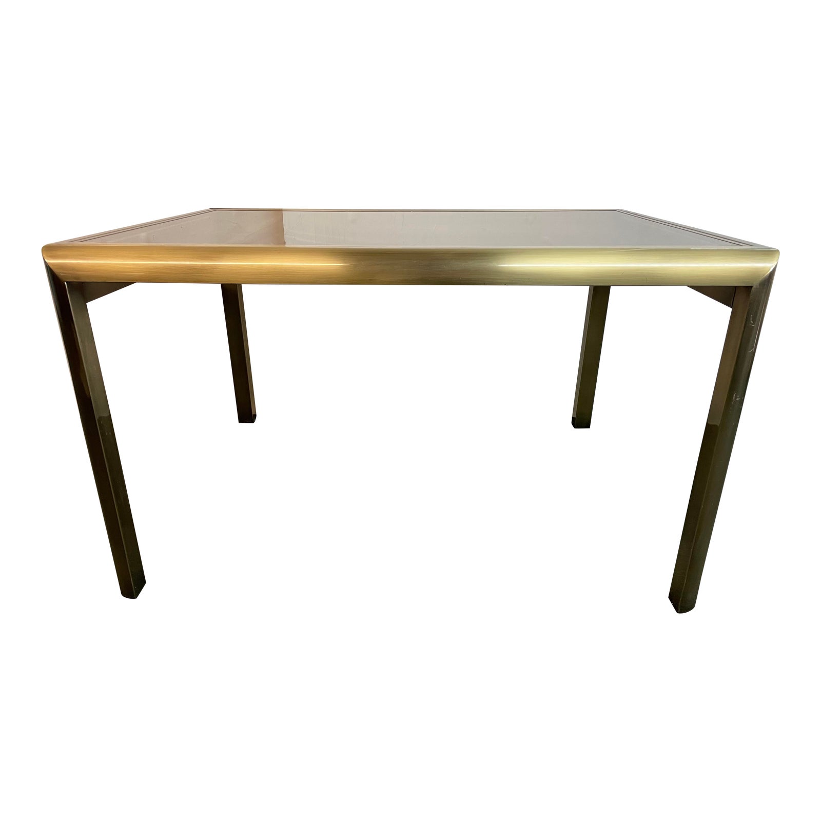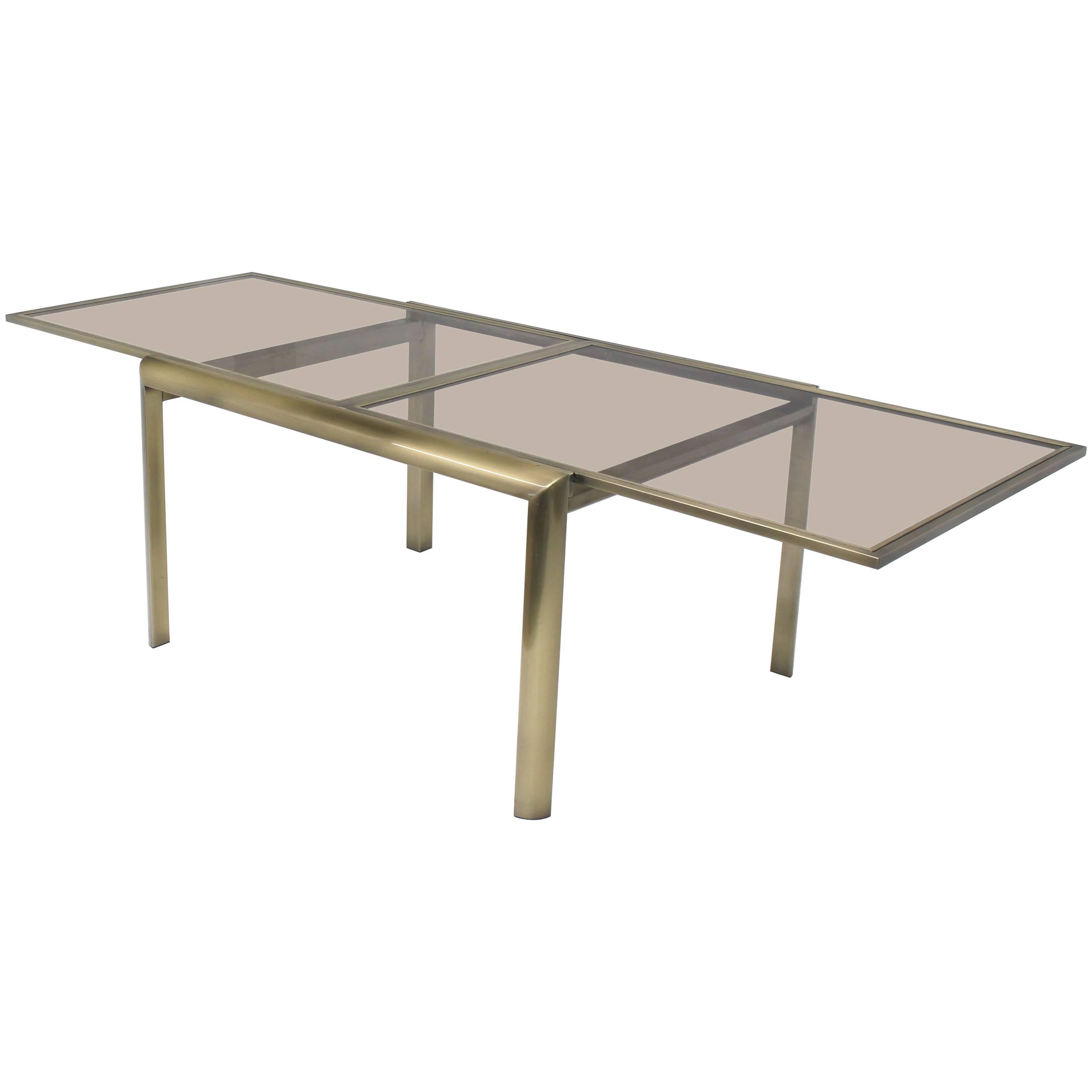 Design Plus Gallery presents a Vintage Extensions Dining Table by Design Institute of America (DIA). A laquered smoked brass finish creates the rounded profile frame of this modern expansion dining table with smoked glass. The length of the table doubles with the self-stored glass leaf popped into place. Light wear as might be expected on frame, glass has minor scratches.