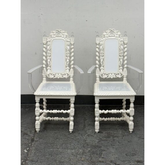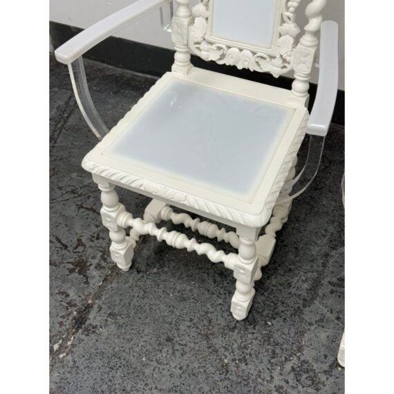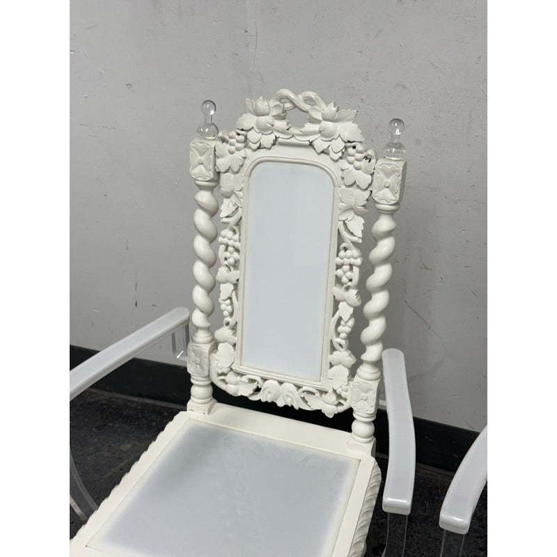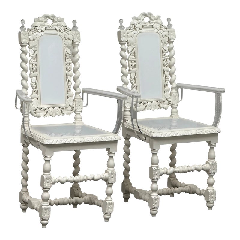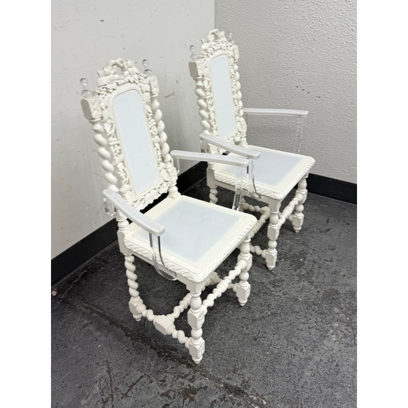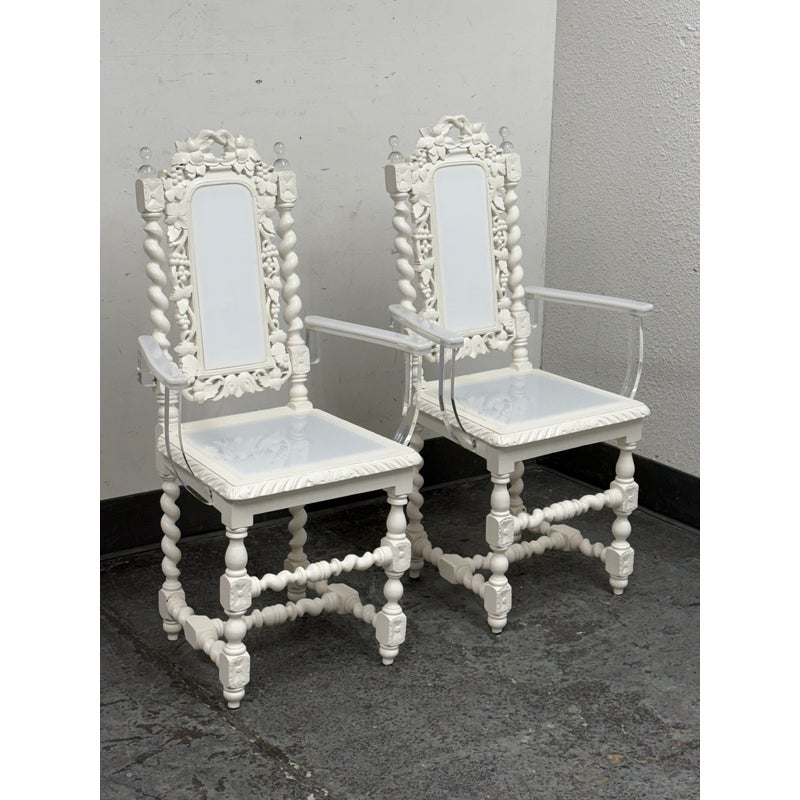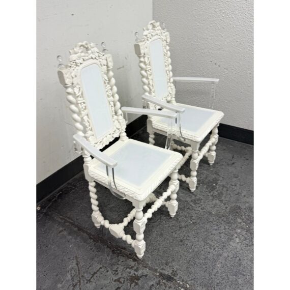 Design Plus Gallery presents a Pair of French Style Hunting Arm Chairs from Maloos Anvarian Furniture Line, DWM. These French-style carved armchairs, Hunting chairs, are a sophisticated addition to your stylish room to transform it into a place for the feast. They have got a solid wood construction and beautiful details. Both chairs feature fluted legs, a carved frame, and sturdy stretchers with twisted shapes. The chairs are painted white, and chair arms in translucent and white lucite are added to turn them into the contemporary art of work. They are in good condition for their usage. Visible and minimal wear on frame. Was showcased showroom items. From the San Francisco Design Center.