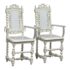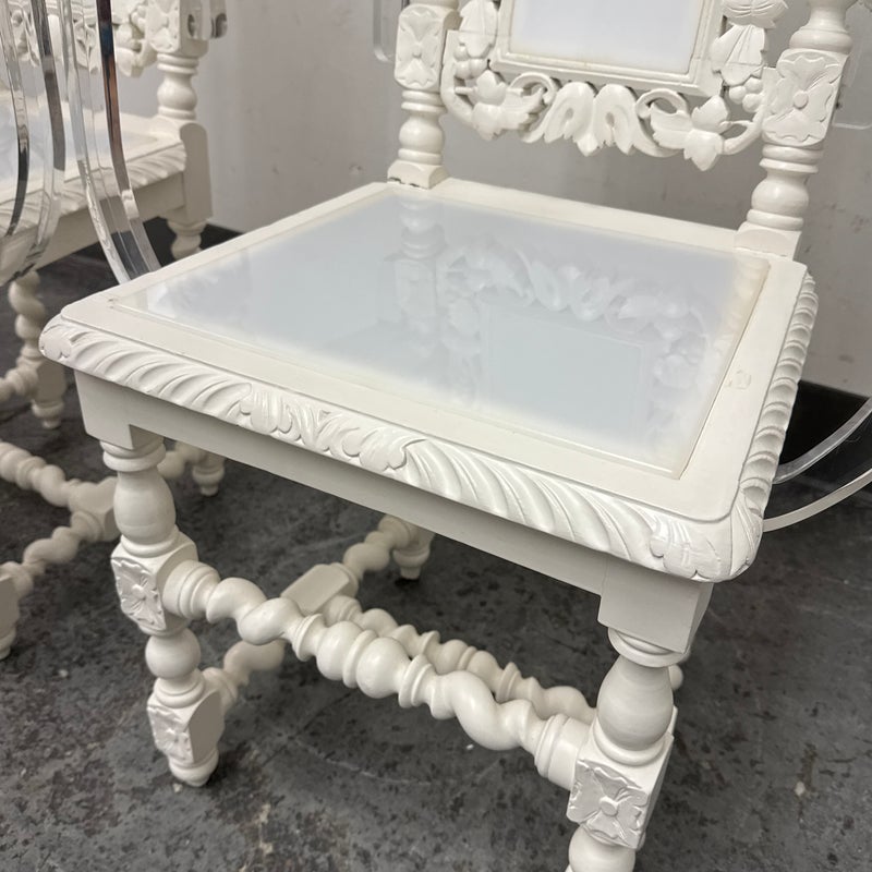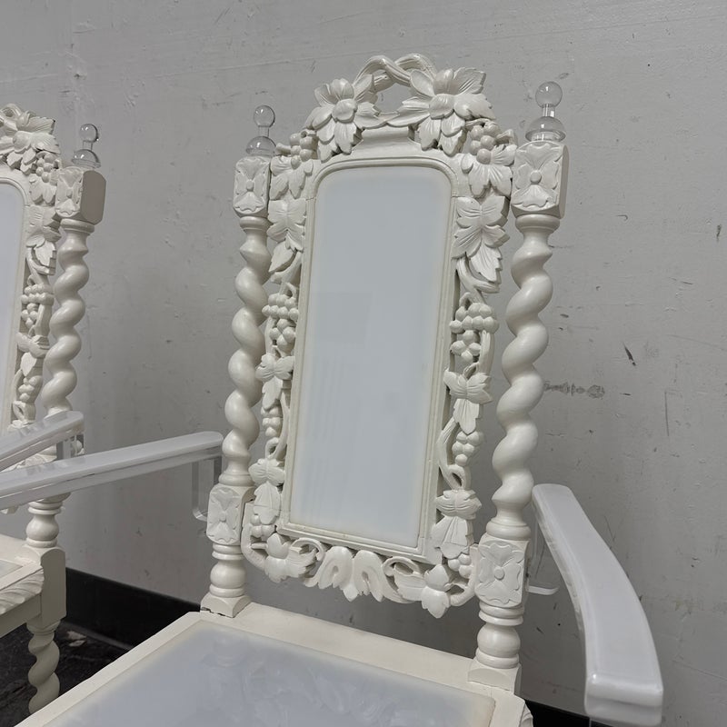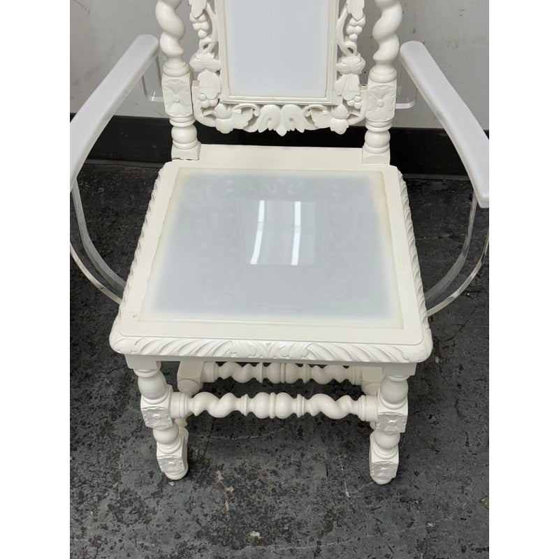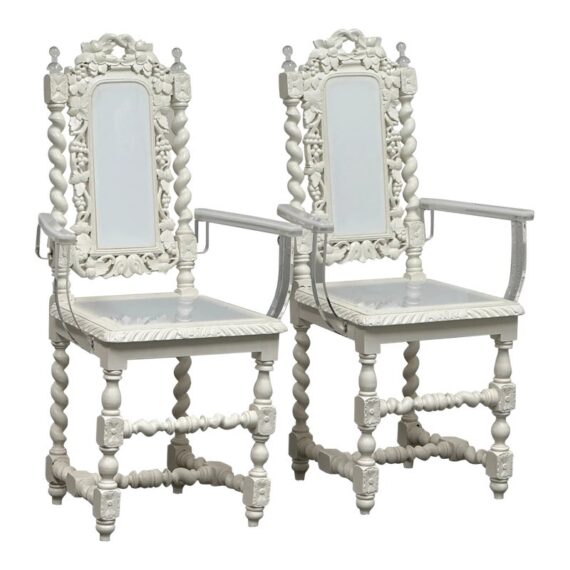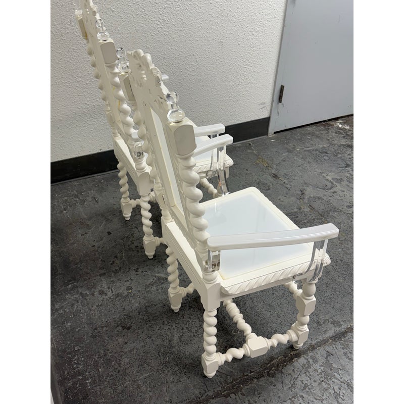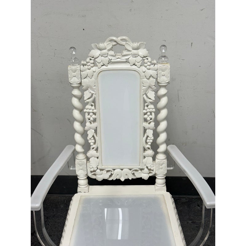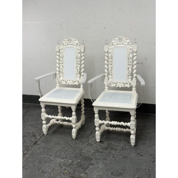 Design Plus Gallery presents a Pair of French Style Hunting Arm Chairs from Maloos Anvarian Furniture Line, DWM. These French-style carved armchairs, Hunting chairs, are a sophisticated addition to your stylish room to transform it into a place for the feast. They have got a solid wood construction and beautiful details. Both chairs feature fluted legs, a carved frame, and sturdy stretchers with twisted shapes. The chairs are painted white, and chair arms in translucent and white lucite are added to turn them into the contemporary art of work. They are in good condition for their usage. Visible and minimal wear on frame. Was showcased showroom items. From the San Francisco Design Center.