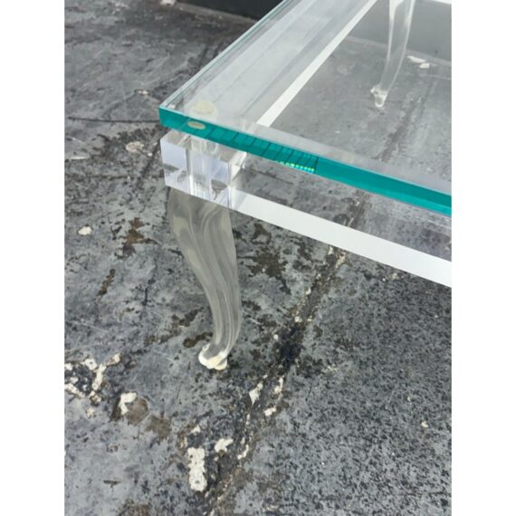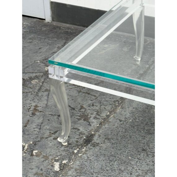Design Plus Gallery presents a Clearly-Louis VX Coffee Table Designed by D W M Maloos. The Clearly Louis XV is made of Lucite, resin with a Diamanté glass top with of three quarter thickness. The table design features a charming mix of traditional and contemporary styles. The square base is made of clear Lucite, which stands on the Louis XV style legs made of resin. Is in good condition with minimal wear for its usage. From the San Francisco Design Center.