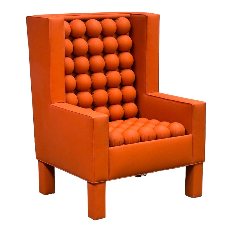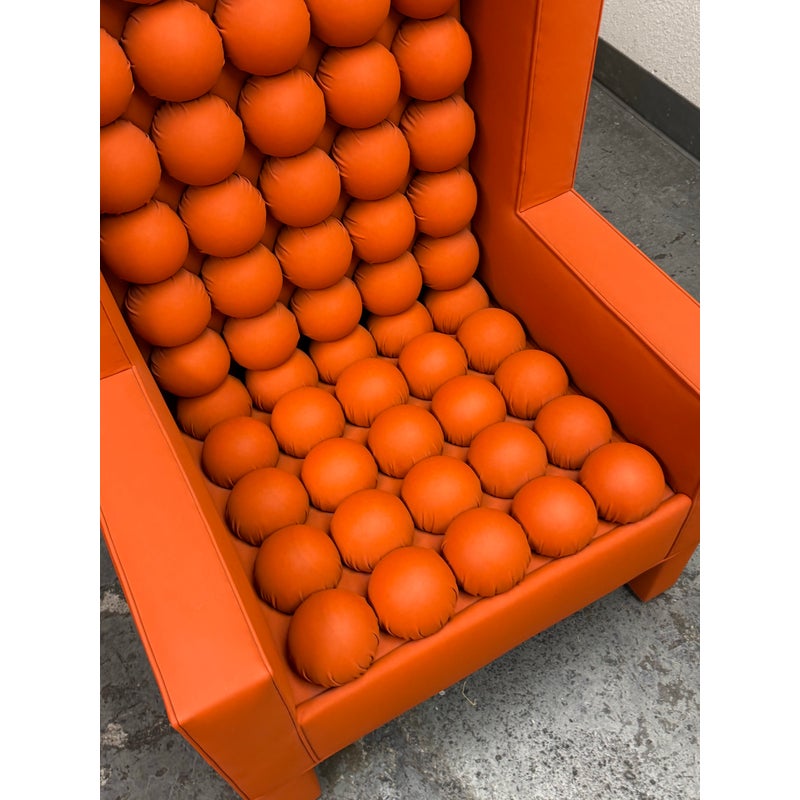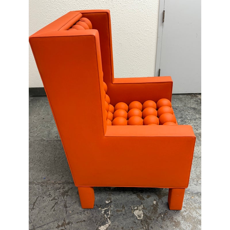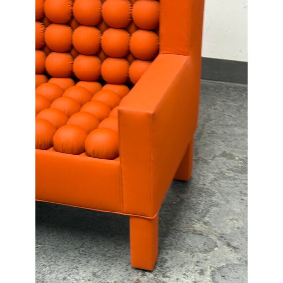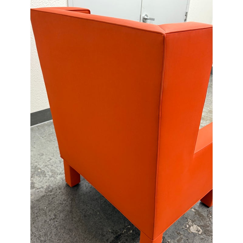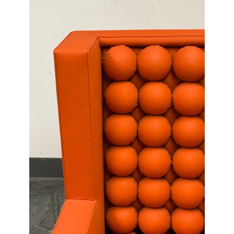 Design Plus Gallery presents the A.B.U. Lounge Chair from Maloos Anvarian Furniture Line, DWM. The lounge chair is wrapped and enhanced with fire orange upholstery that resembles leather. Playing with proportions and textures, their ABU chair resembles a Lego with its interior haveing snowball insets. The chair is in good condition with wear that is consistent with its usage. From the San Francisco Design Center.