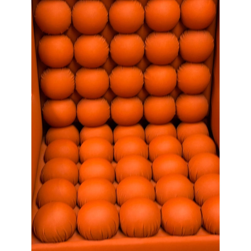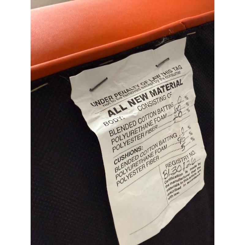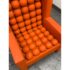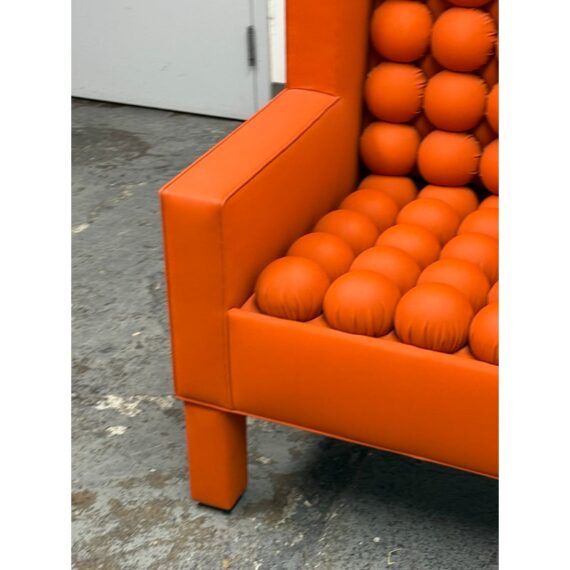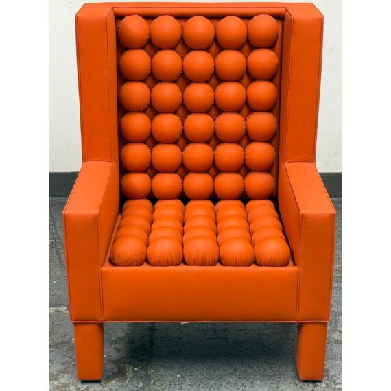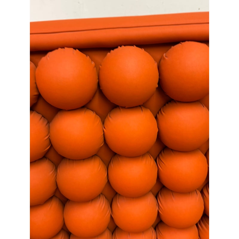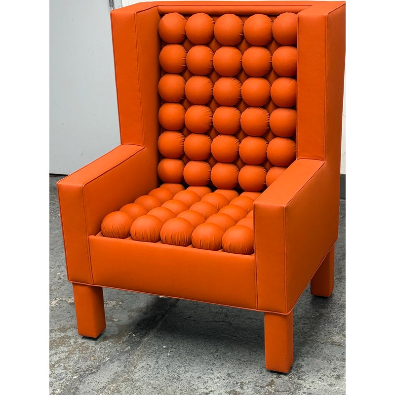 Design Plus Gallery presents the A.B.U. Lounge Chair from Maloos Anvarian Furniture Line, DWM. The lounge chair is wrapped and enhanced with fire orange upholstery that resembles leather. Playing with proportions and textures, their ABU chair resembles a Lego with its interior haveing snowball insets. The chair is in good condition with wear that is consistent with its usage. From the San Francisco Design Center.
