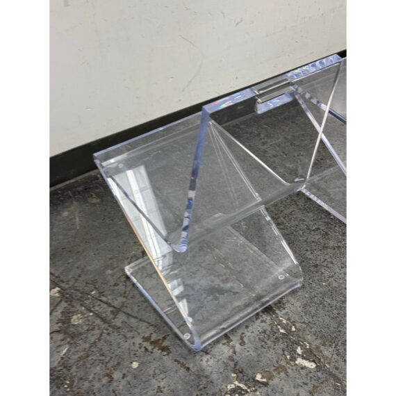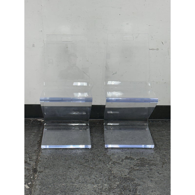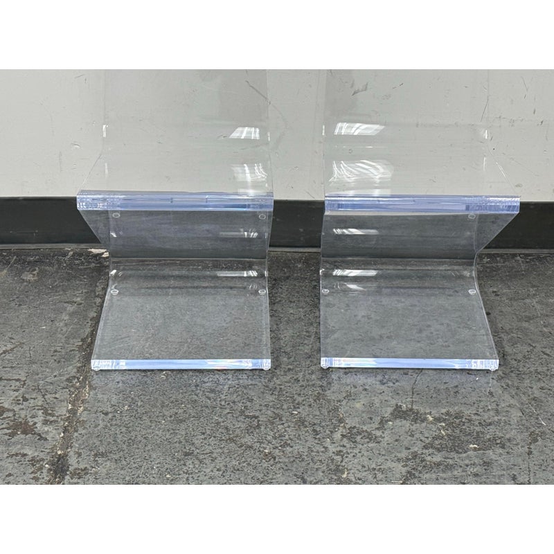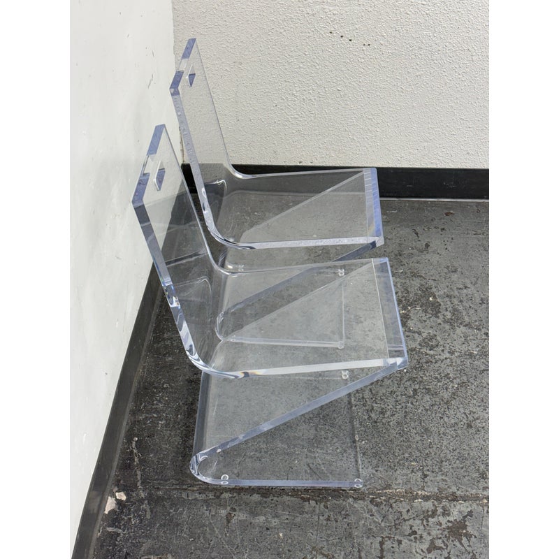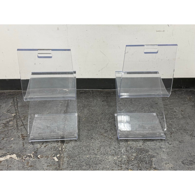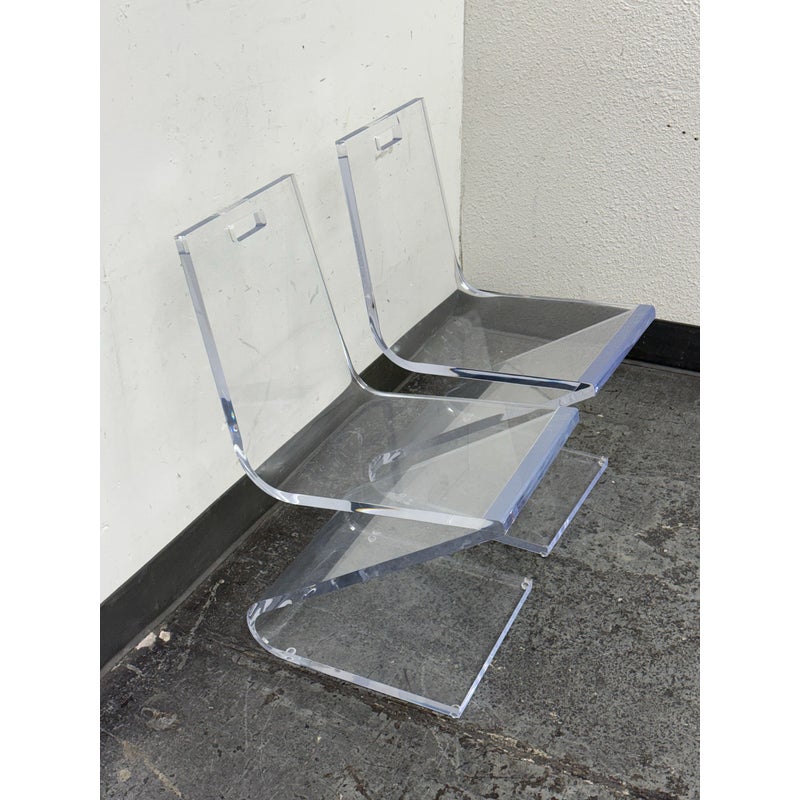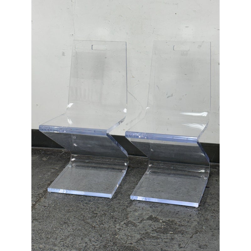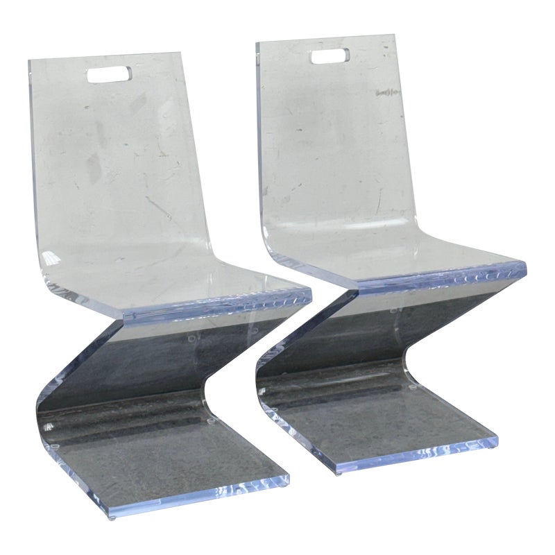 Design Plus Gallery presents a Pair of Lucite Zig Zag Chairs from Maloos Anvarian Furniture Line, DWM. These Z shape chairs are made of high quality Lucite. Their subtle presence with wow shape is a great accent for your home office, living area or for dining purposes. They are in good showroom like condition with minimal wear for their usage. From the San Francisco Design Center.