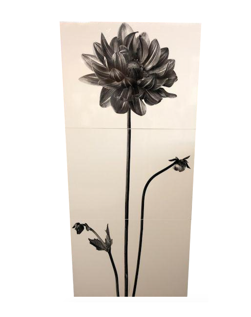 Design Plus Gallery presents a stunning photo by Roy Barloga. Printed on metal plaques, the black and white floral can be hung vertically or horizontally. Minute indentations near flower head.
