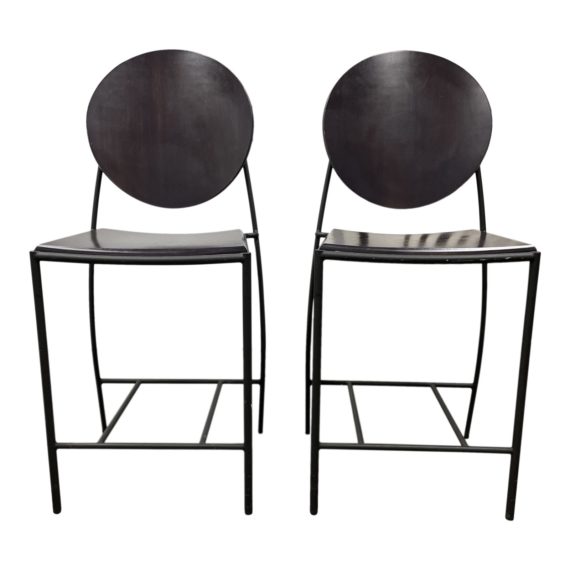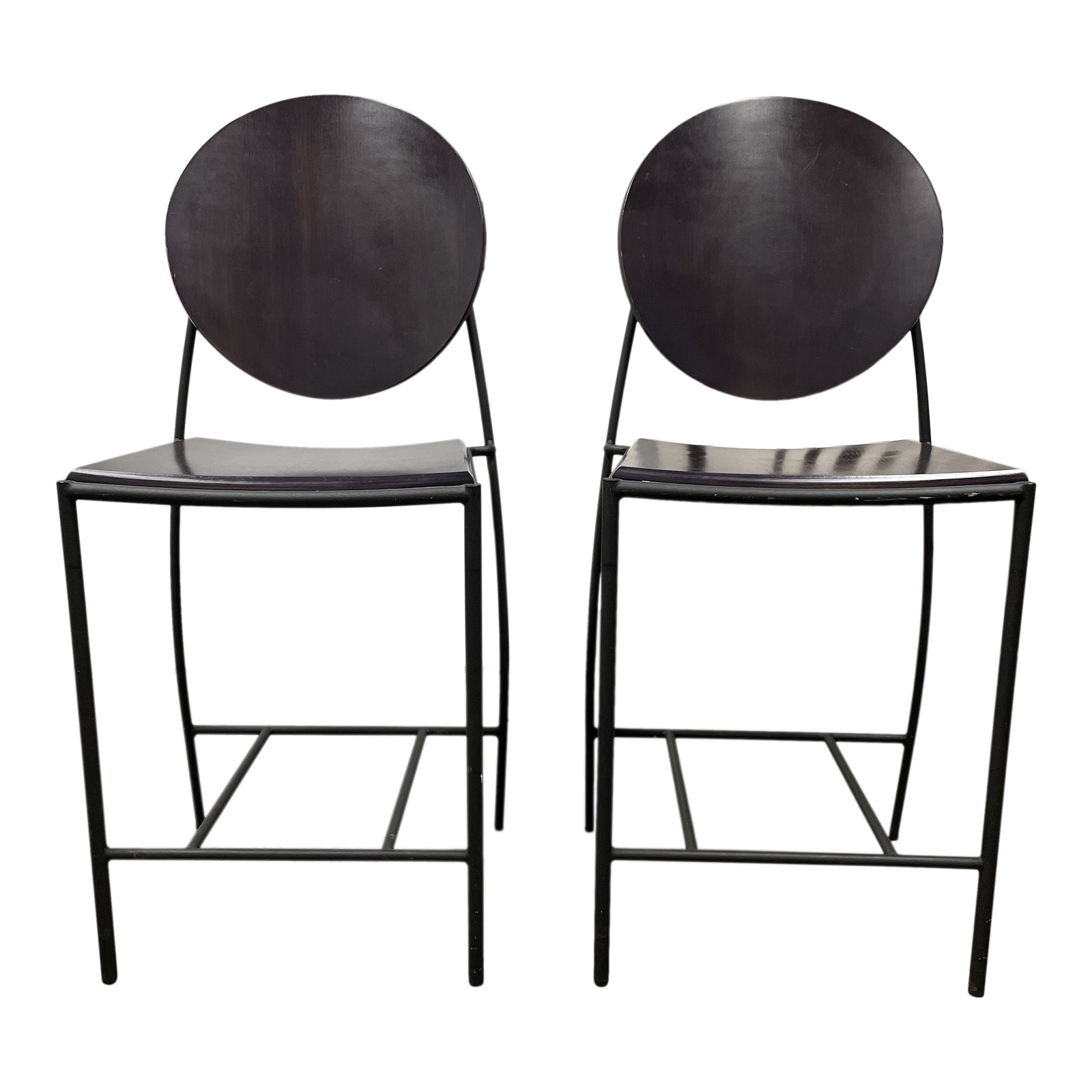 Design Plus Gallery presents a a pair of Dakota Jackson Vik-Ter I Purple Stools. Custom made from the 1990s, by Dakota Jackson. Curved circular backrests on black metal rod frames, with stained wood and square seats. The back legs bow slightly outward. The backrests are a black with steam bent purple seats. Visible wear, good condition