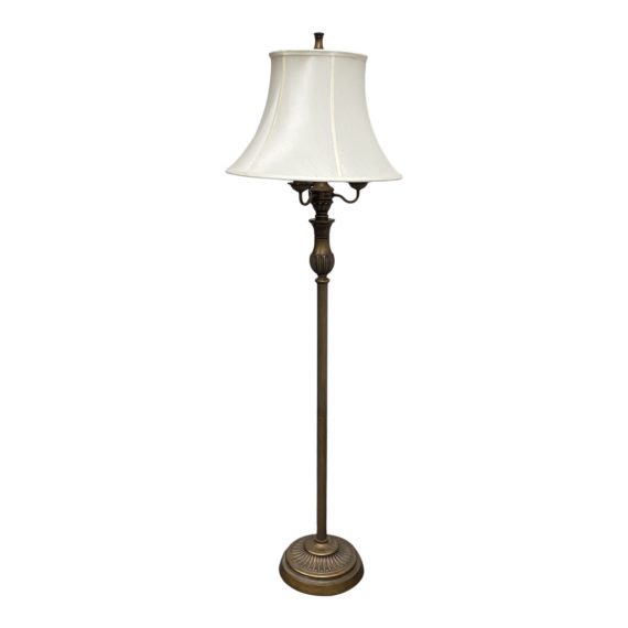 Design Plus Gallery presents a Dale Lighting Floor Lamp. Wrought iron style base has a lovely antiqued bronze patina. Ivory tapered shade is illuminated with three candelabra style bulbs inside. Minor wear through out, floor lamp is in good condition.