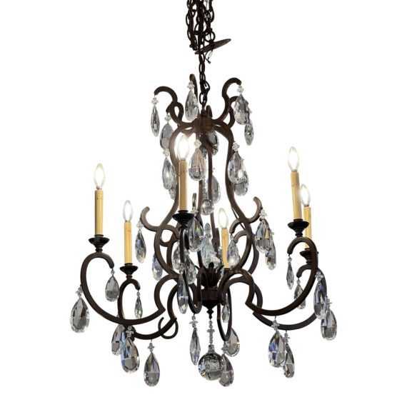 Design Plus Gallery presents an Eight Light Iron Chandelier by Dana Creath Designs. Referencing swirling French lighting of centuries past, this elegant chandelier contrasts a rustic bronze finish with faceted crystals dripping from every curve. Eight “candles” set the crystals glittering and your room aglow. Little evidence of wear; overall good condition.