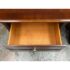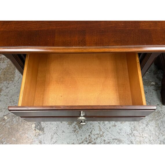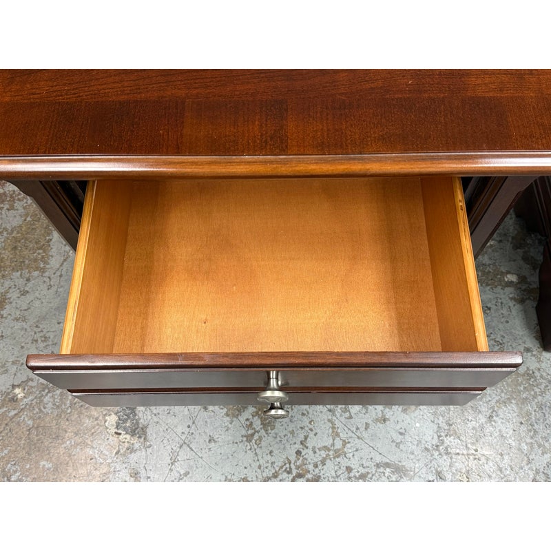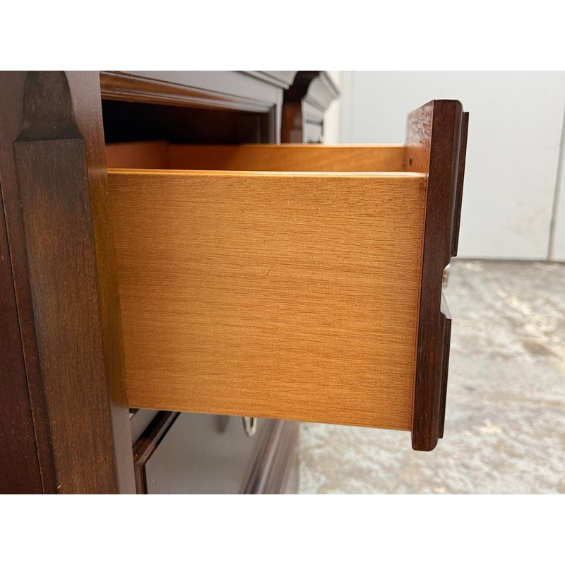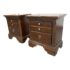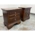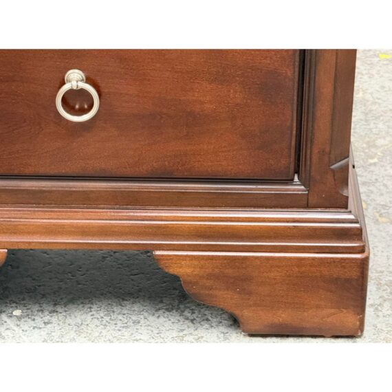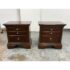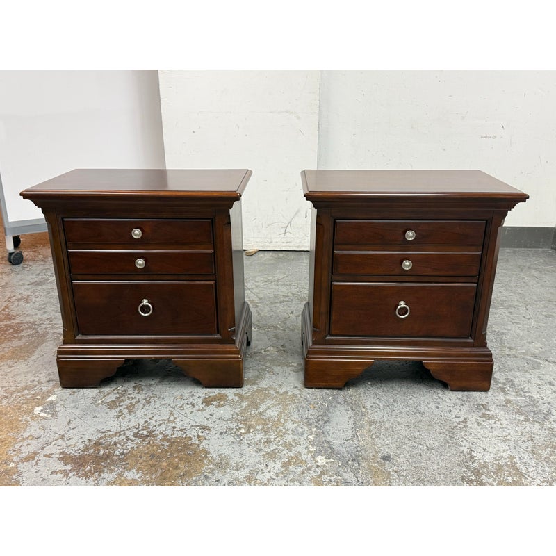 Design Plus Gallery presents a pair of Traditional Nightstands. This matching pair showcases a classic two drawer design with paneled drawer fronts, molded trim, bracket-style bases, and silver-tone knob and ring-pull hardware. The cherry-toned wood surfaces display a polished appearance with visible grain variation and traditional detailing throughout. Each nightstand includes two drawers with lighter interior construction and smooth storage access. They are in good condition with visible and minimal wear from usage.