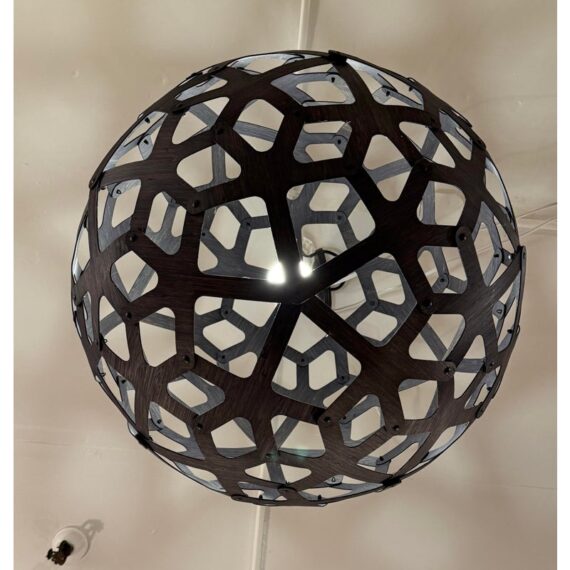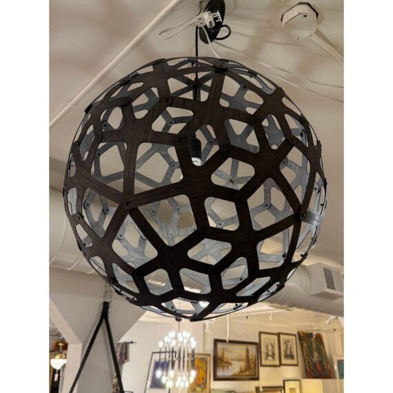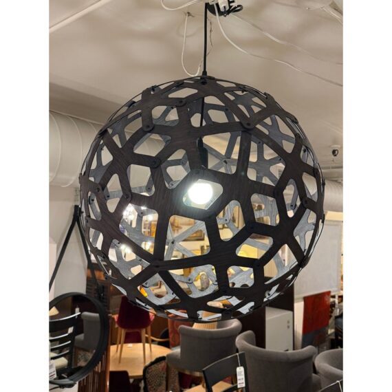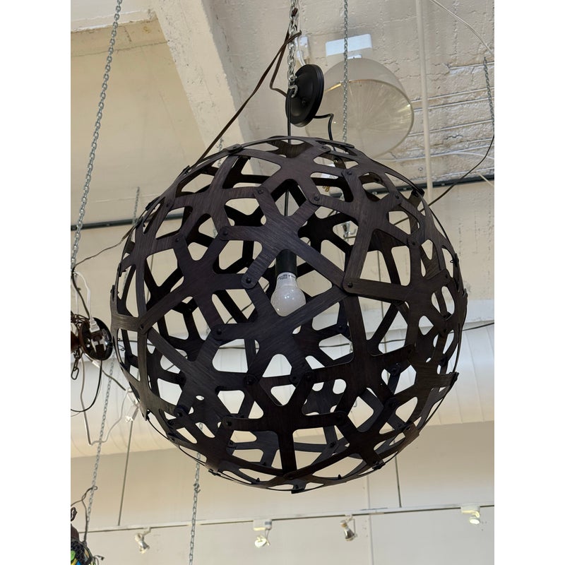 Design Plus Gallery presents a Coral Pendant designed by David Trubridge Lighting. Sea-inspired, the mesmerizing structure is crafted of starfish shaped pieces that come together like a coral reef. The black wash exterior + interior casts an ambient light with shadows. Made in New Zealand. Little wear; condition is good.