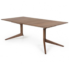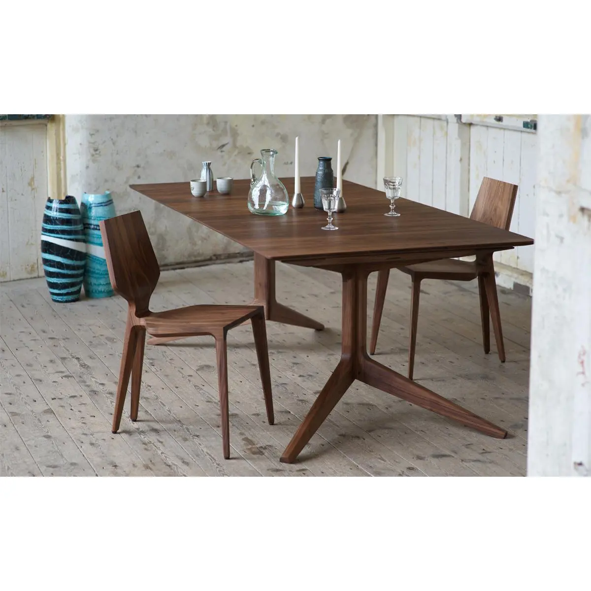 Design Plus Gallery presents a Light Extending Table by De La Esapda. Designed and crafted by Mathew Hilton. Reflecting his interest in the concept of ‘impossible lightness,’ where he tries to create the feeling of greater spaciousness in a room by reducing the visual weight of his furniture. Surprisingly slender, this table features a chamfered edge and a cantilevered leg with complex joinery. Crafted in a walnut, visible discoloration due to sun exposure. Two extensions are original finish, darker shade than table. Minor condition on surface and pedestals.