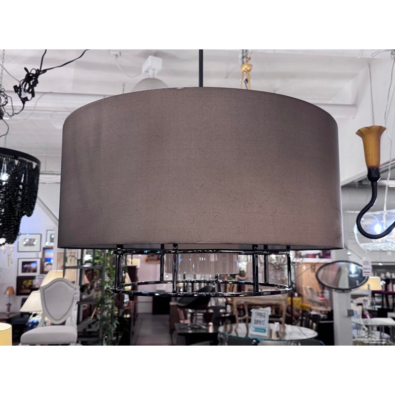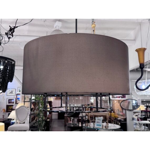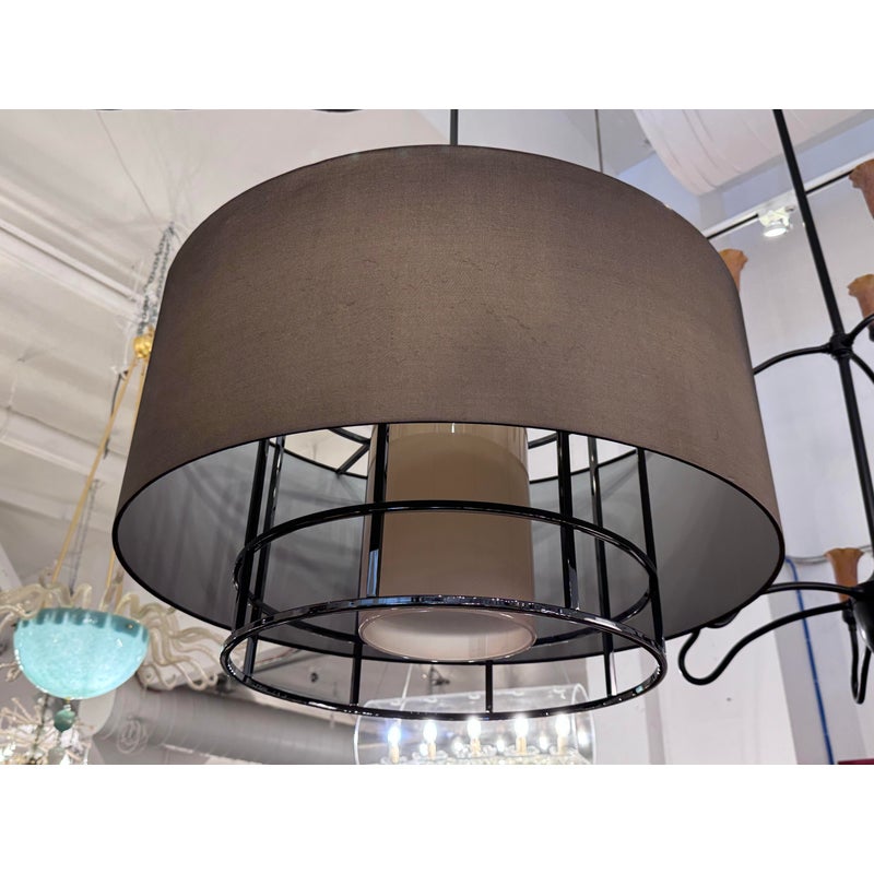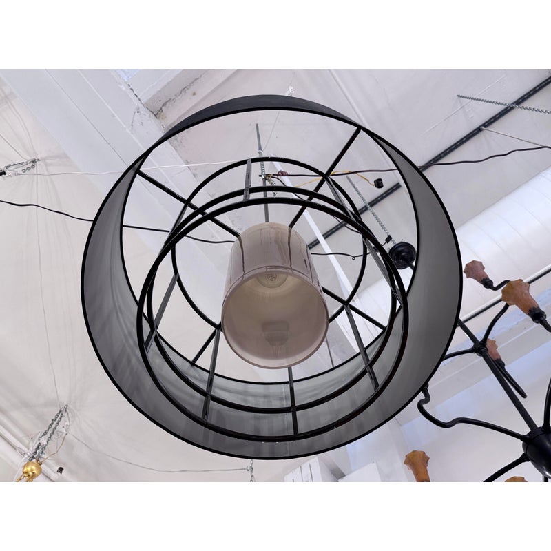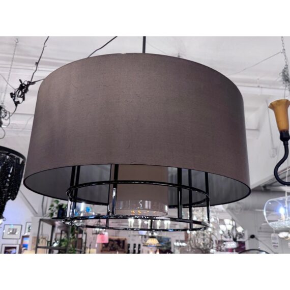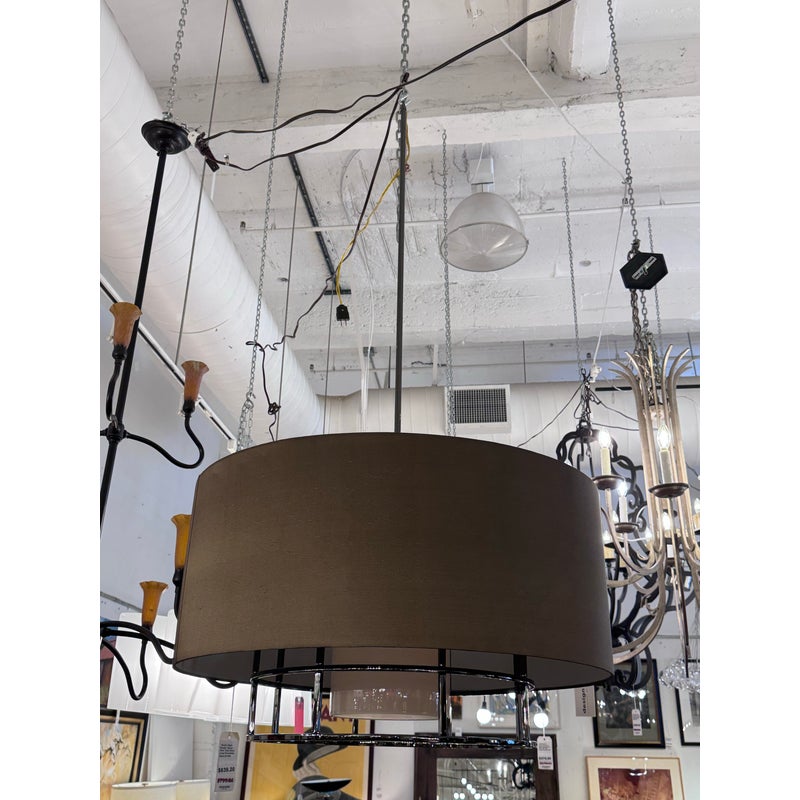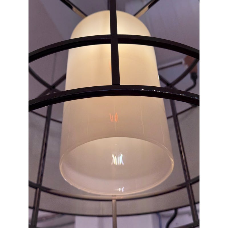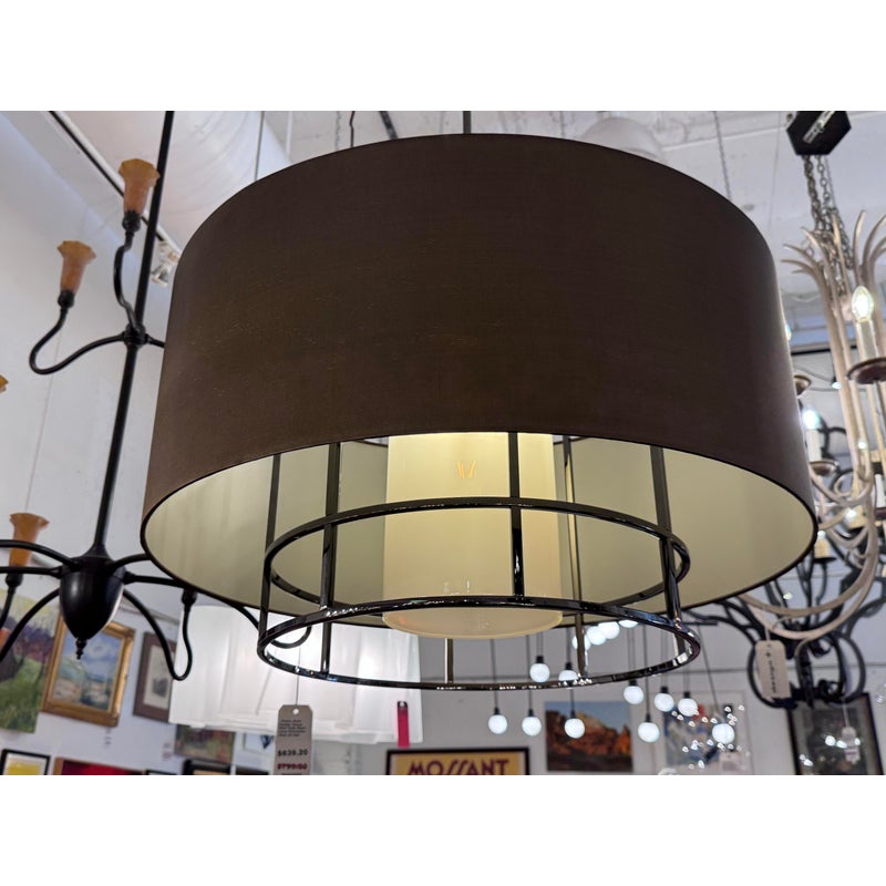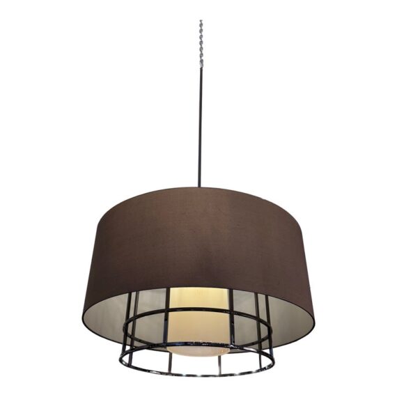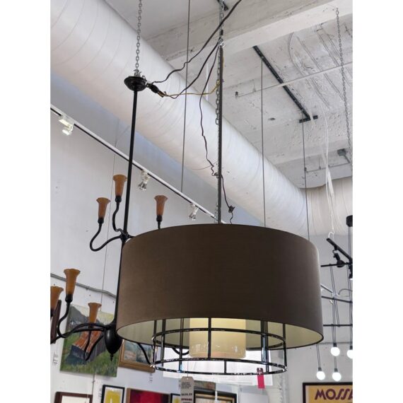 Design Plus Gallery presents the Annecto Chandelier from Designer Debra Weninger Studio. Gorgeous light from the very center offers a tube of milky glass radiating through a metal chamber of dark bronze. The all encompassing shade is a hard material in a nougat tone. The chandelier is in showroom like condition with minimal wear for its age. Does not come with a ceiling plate.