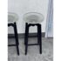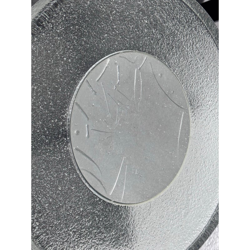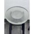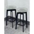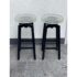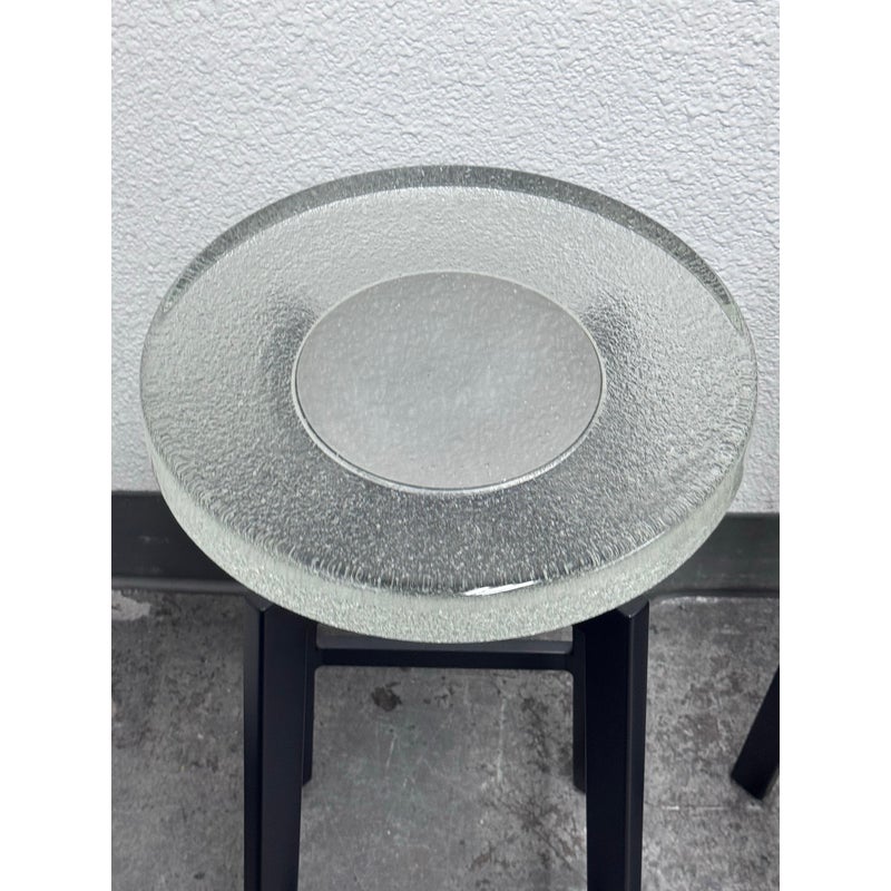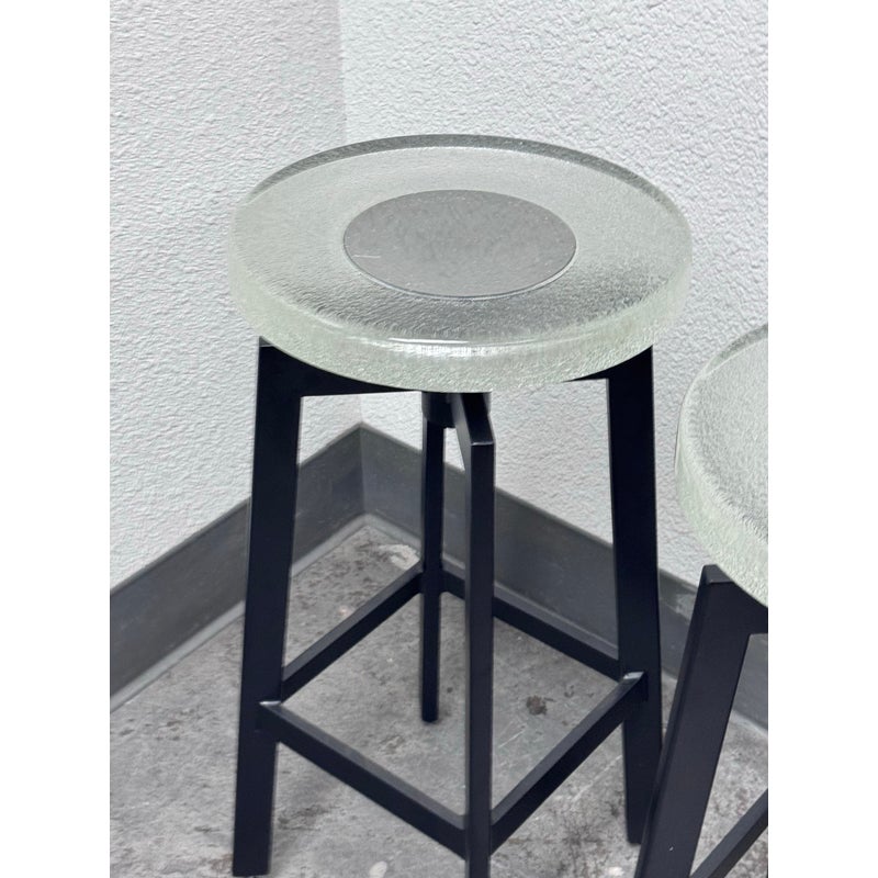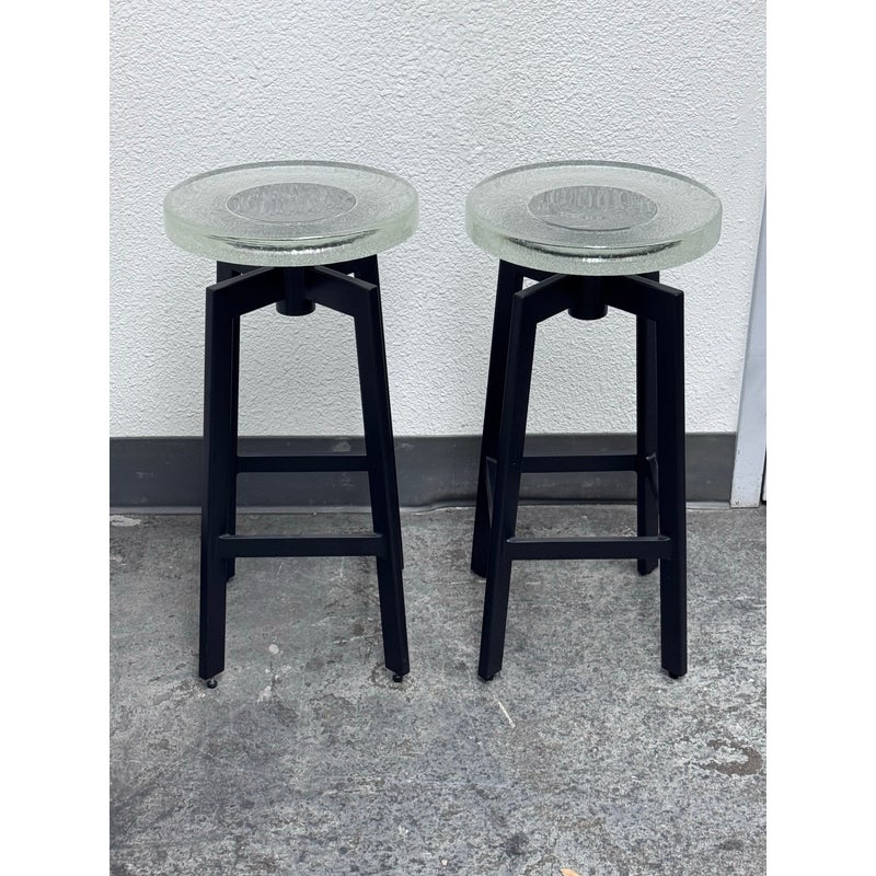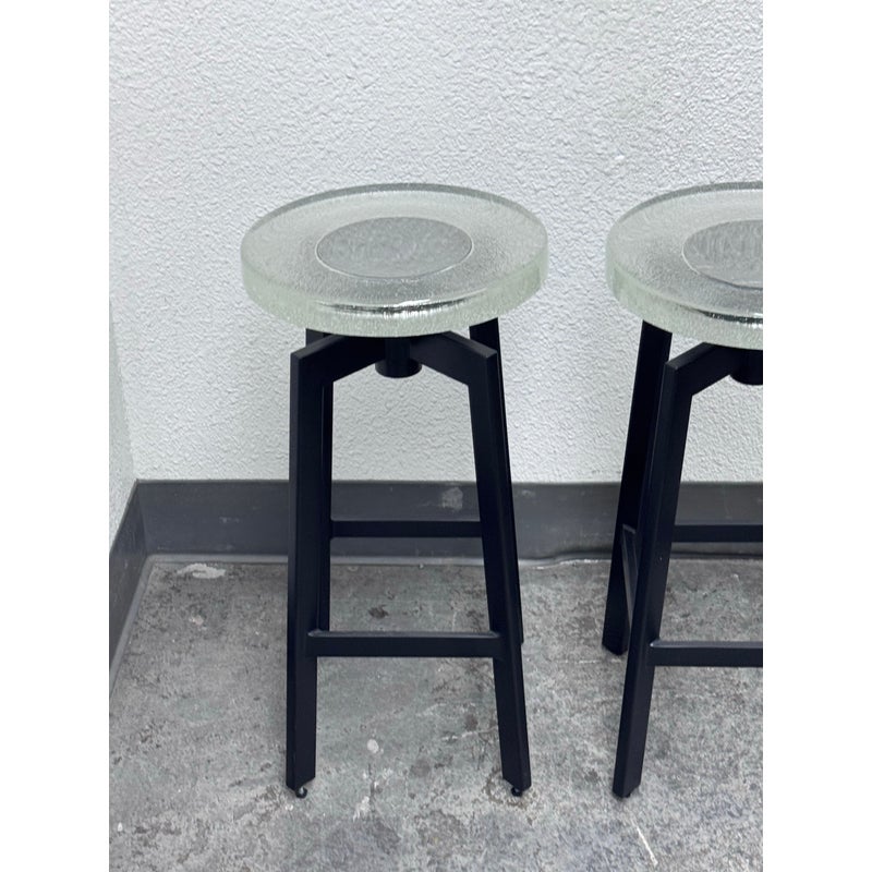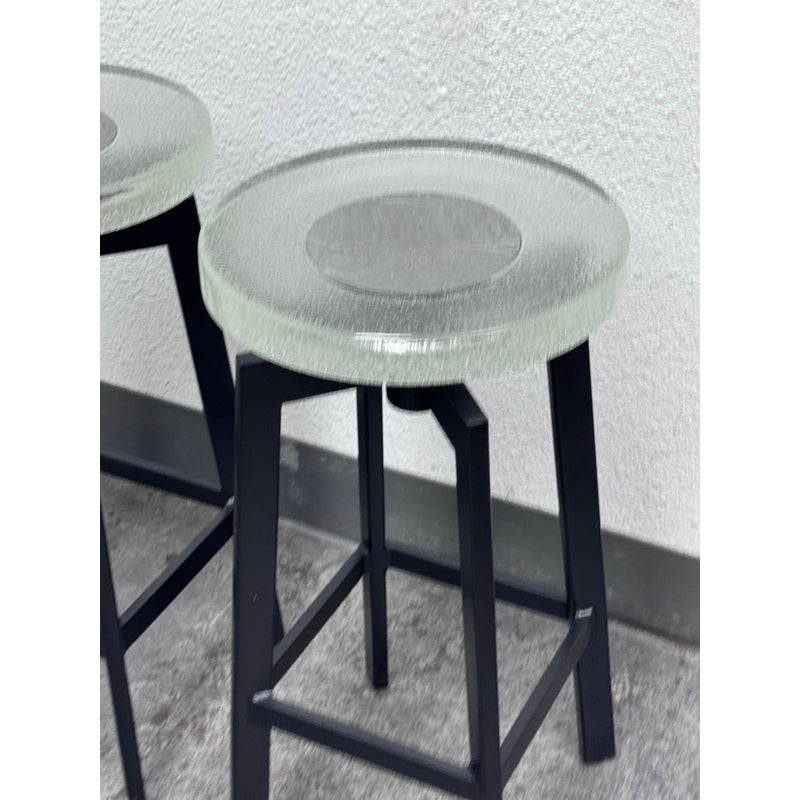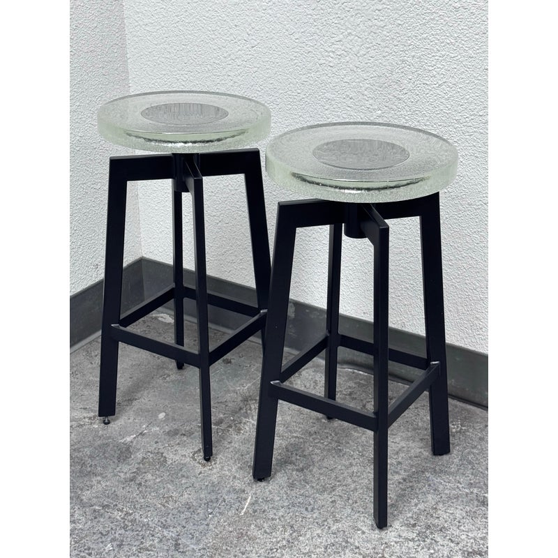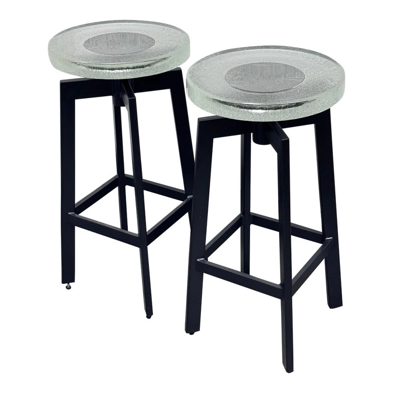 Design Plus Gallery presents a Pair of Rockwell Bar Stools by Debra Weninger Custom Design Studio. The seat of the stools are made of a process of casting glass. This is achieved when molten glass is poured into a mold and allowed to cool and harden, creating a unique, often three-dimensional piece. The frame of the stools are made from hyper-modern blackened steel. They are in good showroom like condition with minimal wear for their usage.
