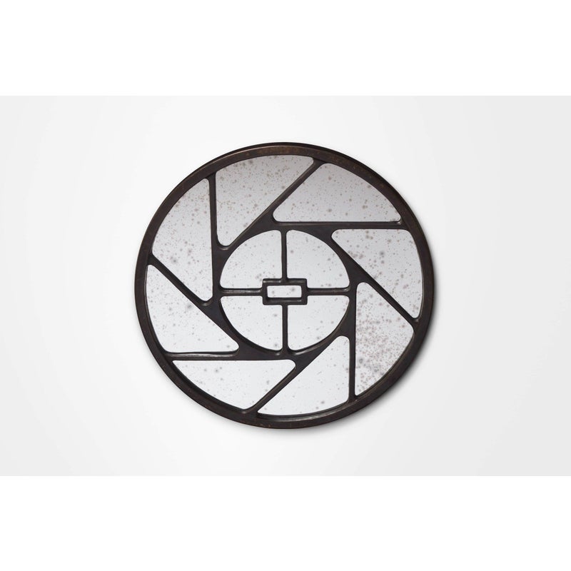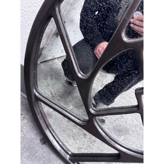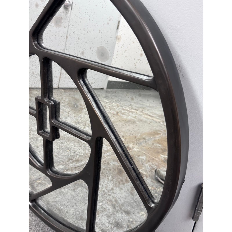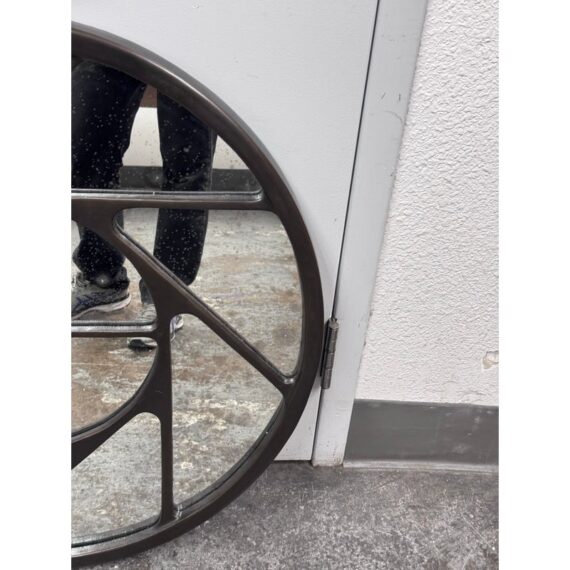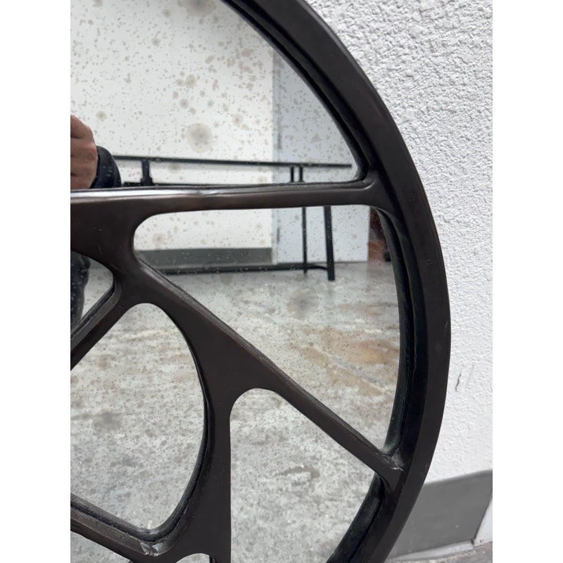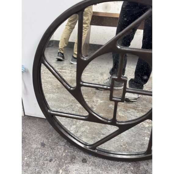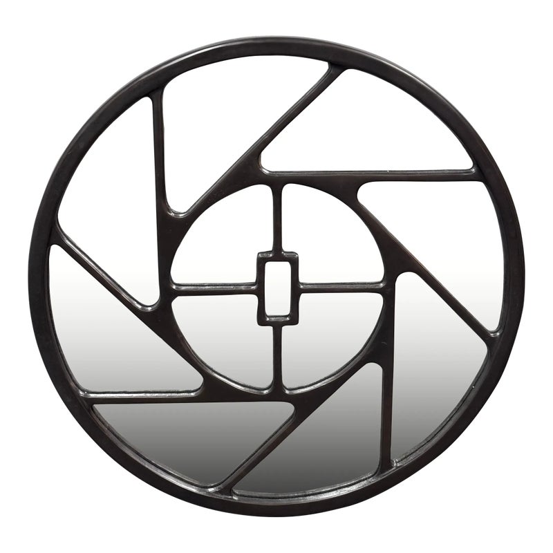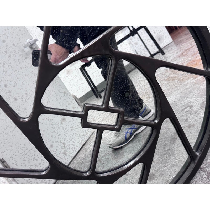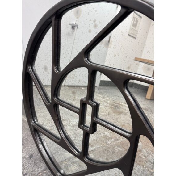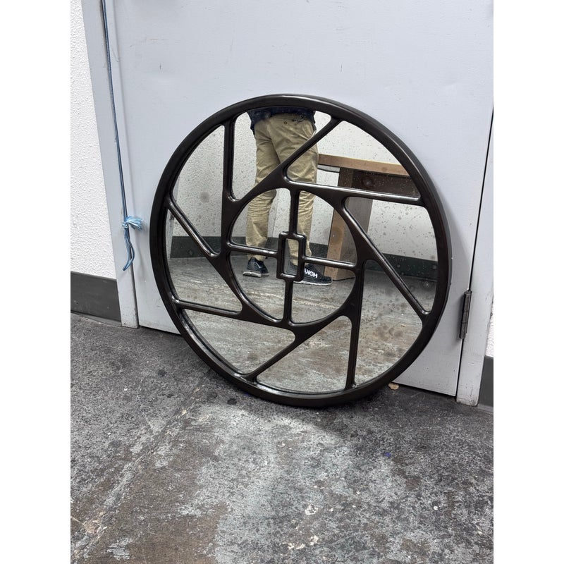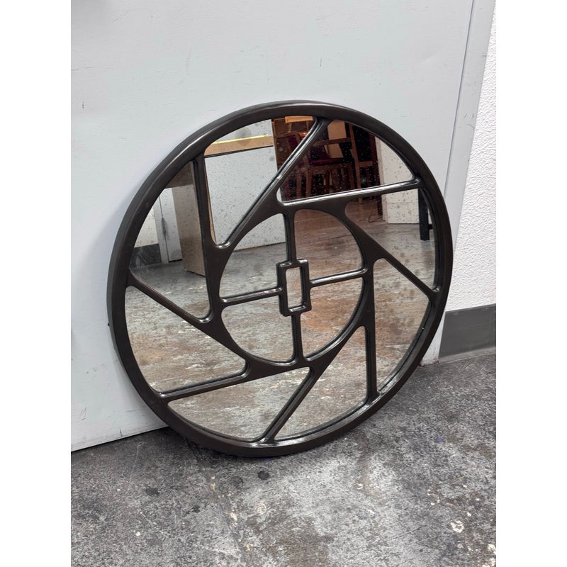 Design Plus Gallery presents the Detour Mirror Custom Designed by Debra Weninger. The style of the mirror is as if a French antique and was hand made in a dark wood. The essence of this mirror is in the logarithmic spiral, a type of spiral where the distance between the points of the spiral increases proportionally to the distance from the center. I.e. the Golden Ratio. The mirror is in good condition for its usage with minimal wear for its age and was used as a showroom sample.
