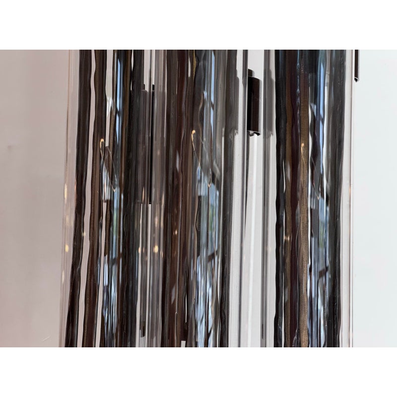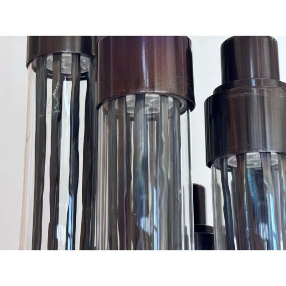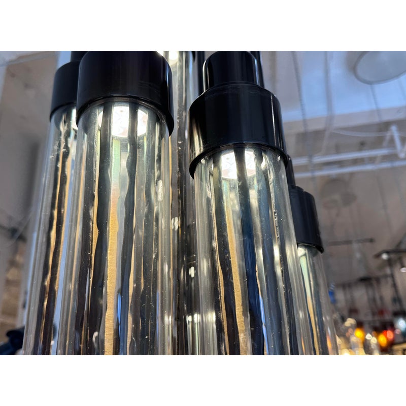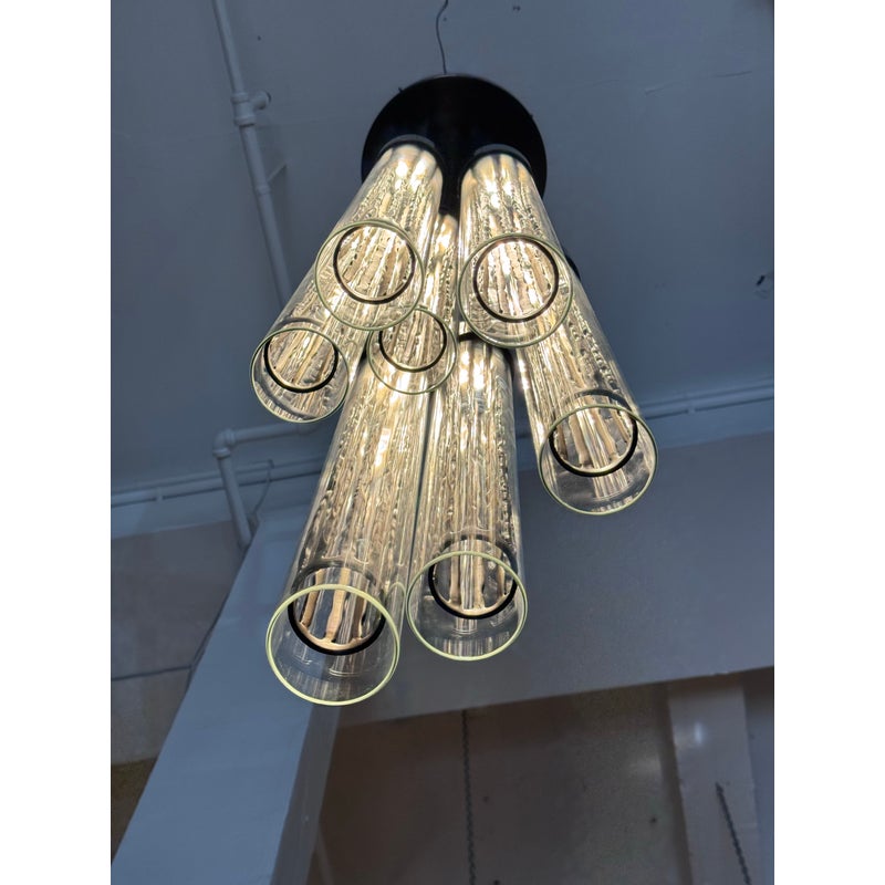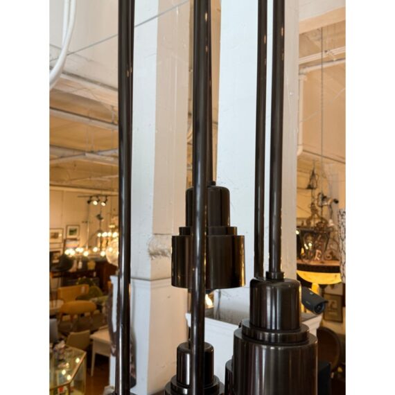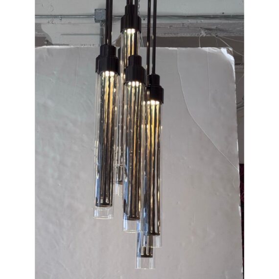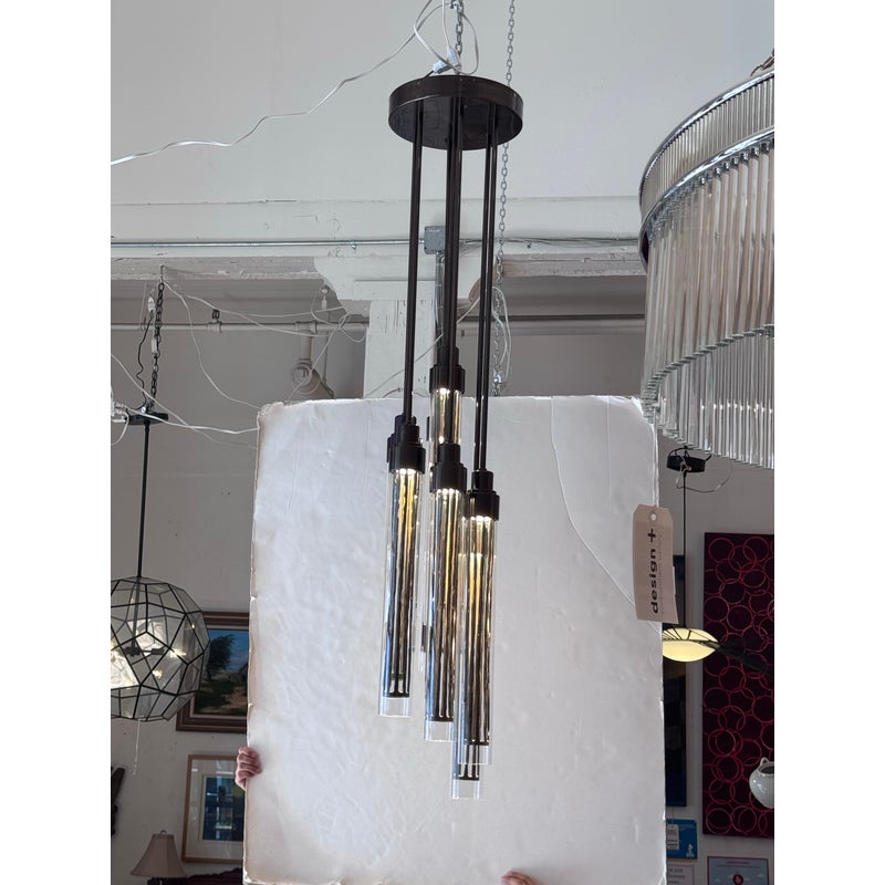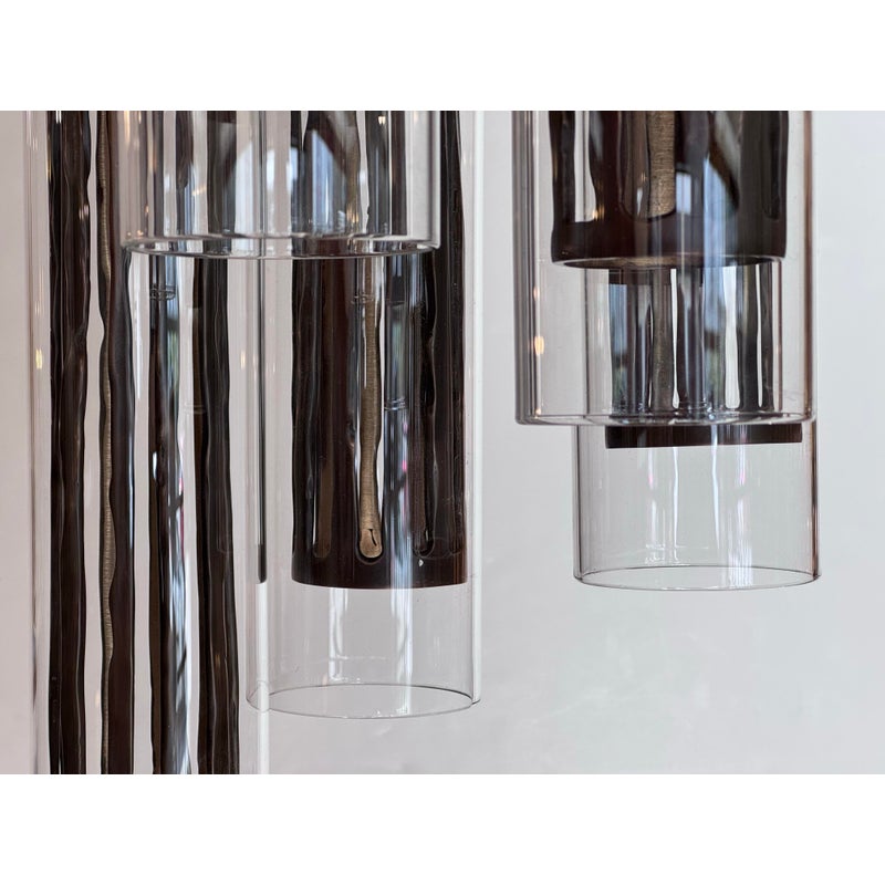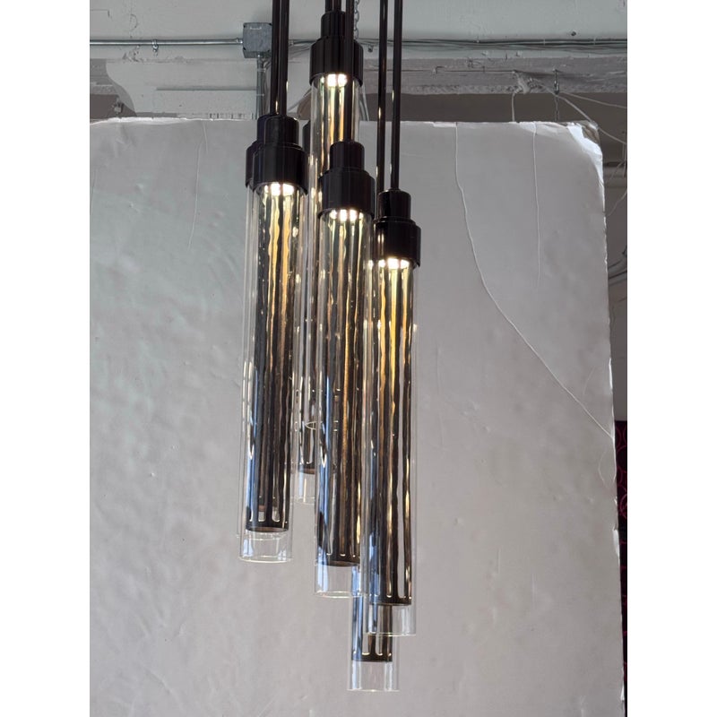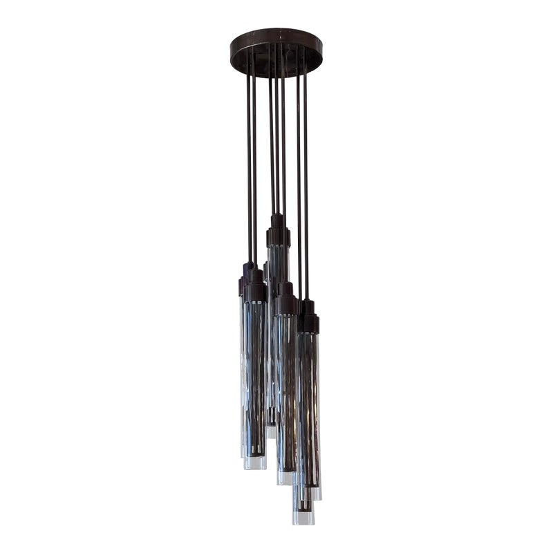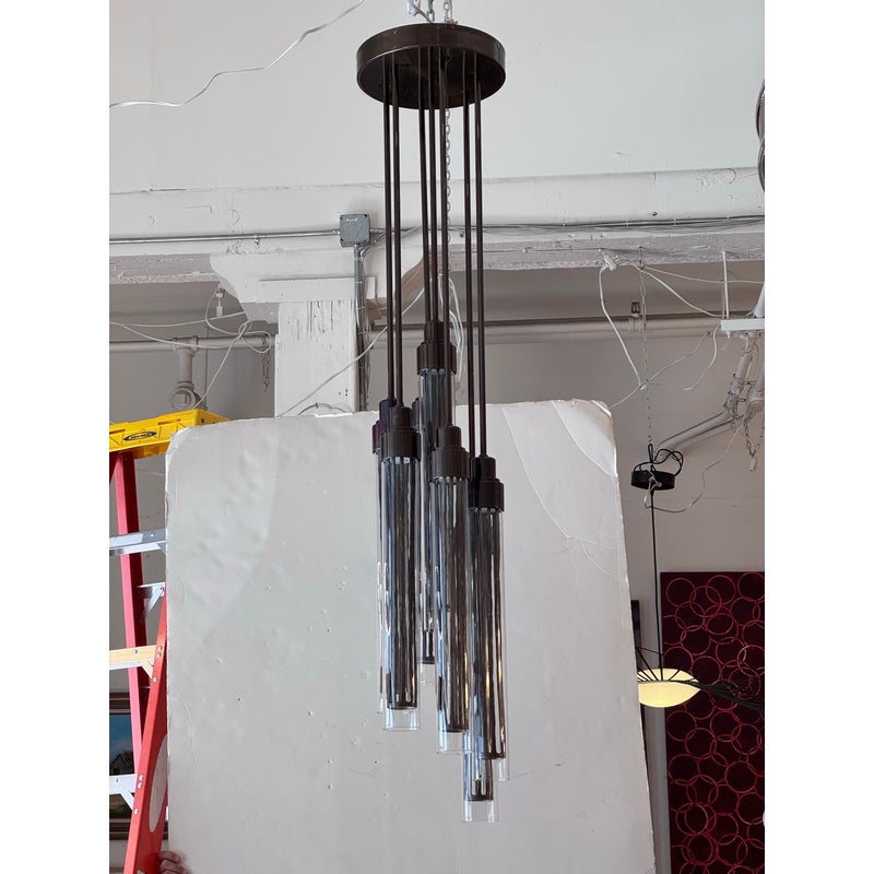 Design Plus Gallery presents a Duneland Chandelier from Debra Weninger Design. The light fixture has seven hanging aged bronze cylinders all attached to a circular mount for the ceiling. The rich bronze finish and ht glow of the light through the thick glass tubes is mesmerizing. The Duneland chandelier is as beautiful offers an alluring appeal. Is in good condition showroom like condition with minimal wear.