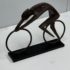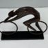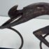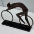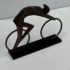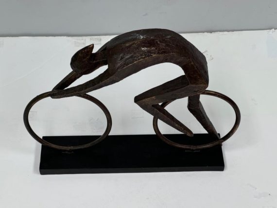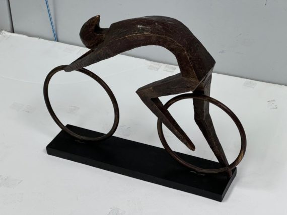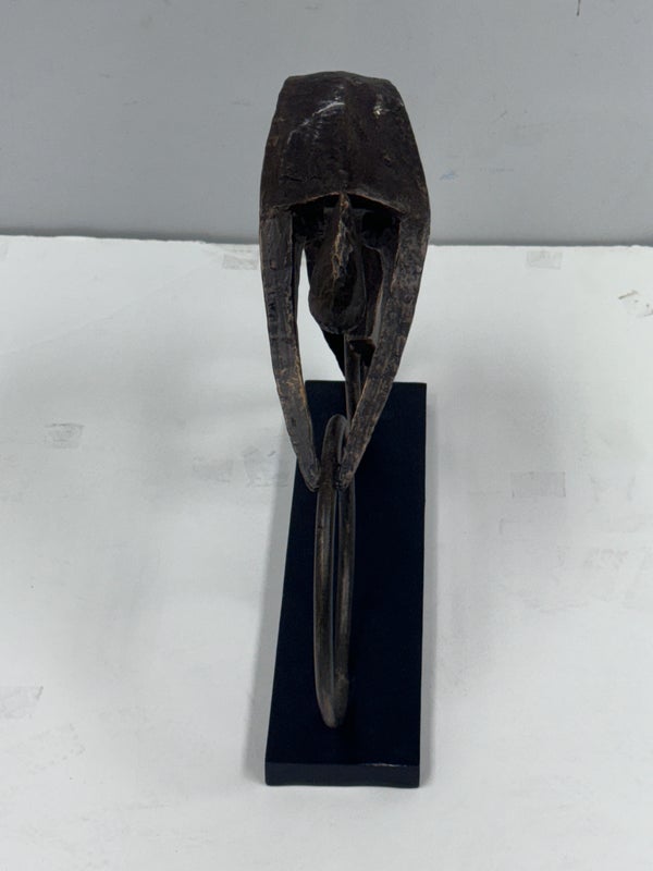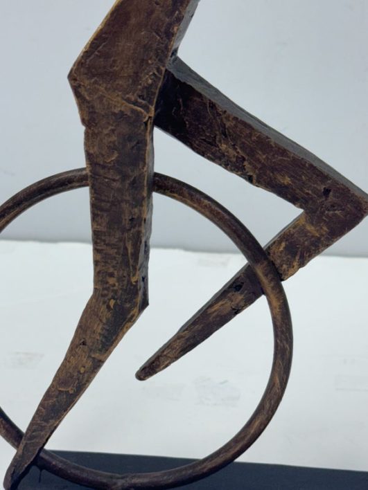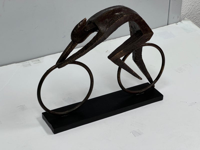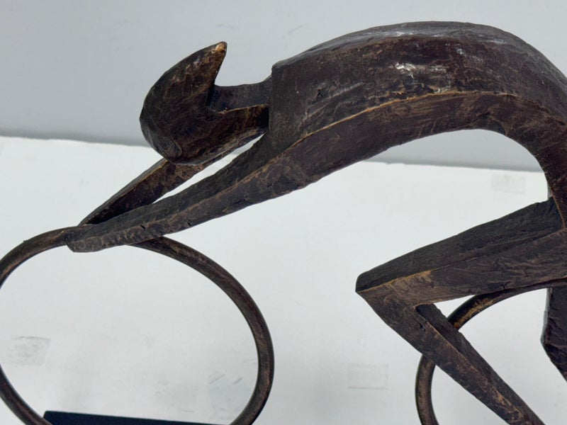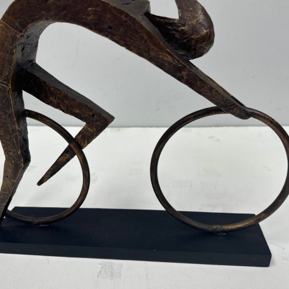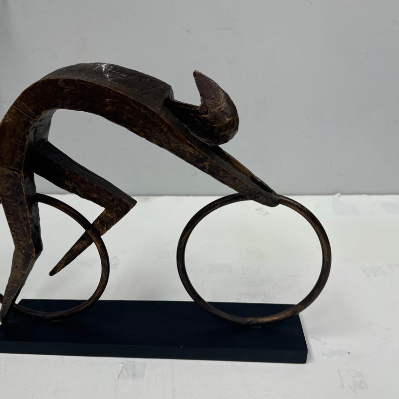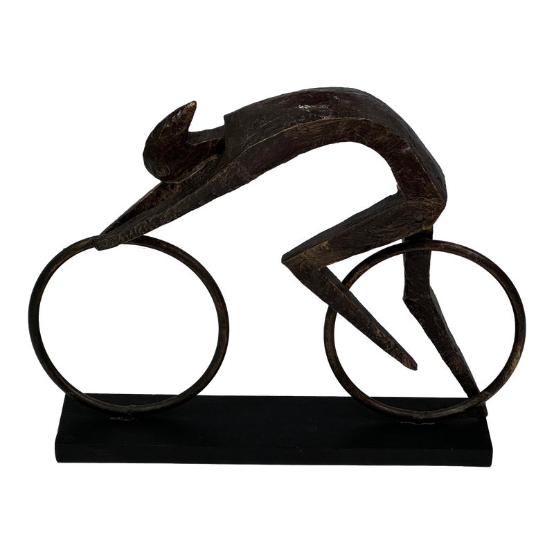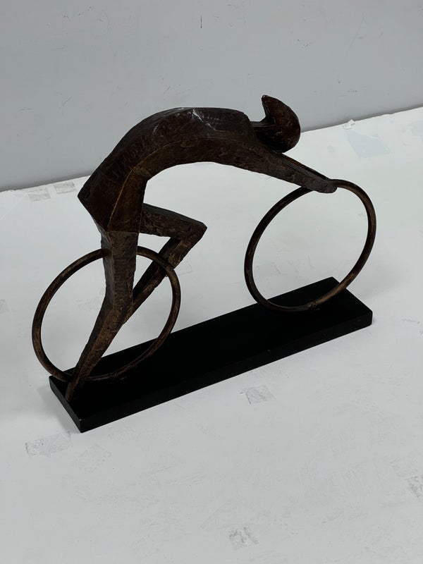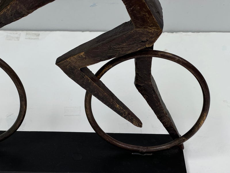 Design Plus Gallery presents a Bike Statue by Deco 79. Designed with rugged charm and edgy allure, where metal finishes and raw materials unite to create an urban aesthetic that showcases your artistic expression. This industrial-themed sculpture is crafted with solid polystone. This item highlights a distressed chocolate brown overall finish. Carved angles form the arched cyclist body with heavy texture, bicycle is only represented by 2 metal circles forming the wheels. n good condition, minimal wear from use.